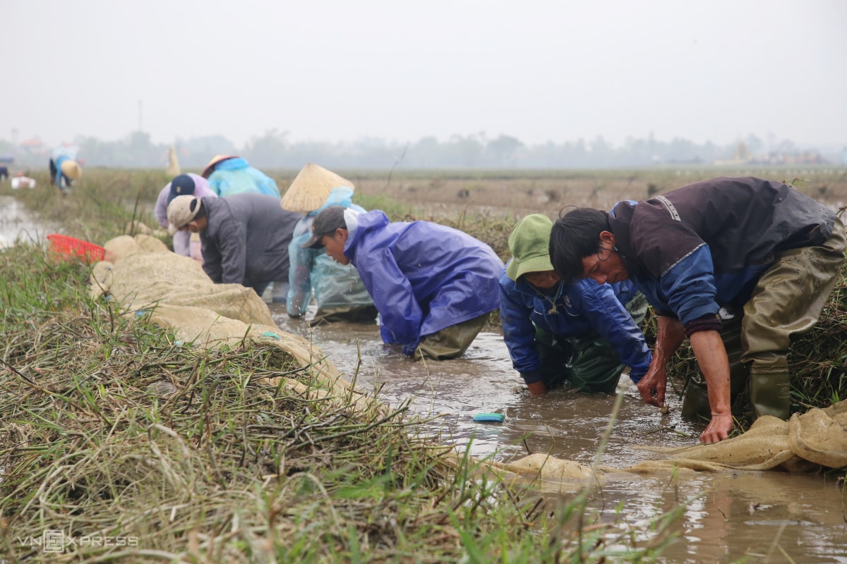 Thu hoạch cá trên ruộng lúa bỏ hoang