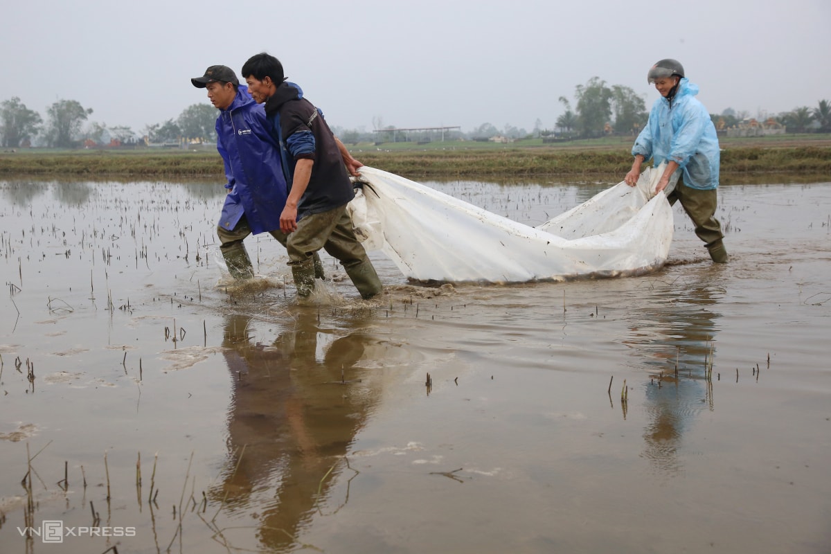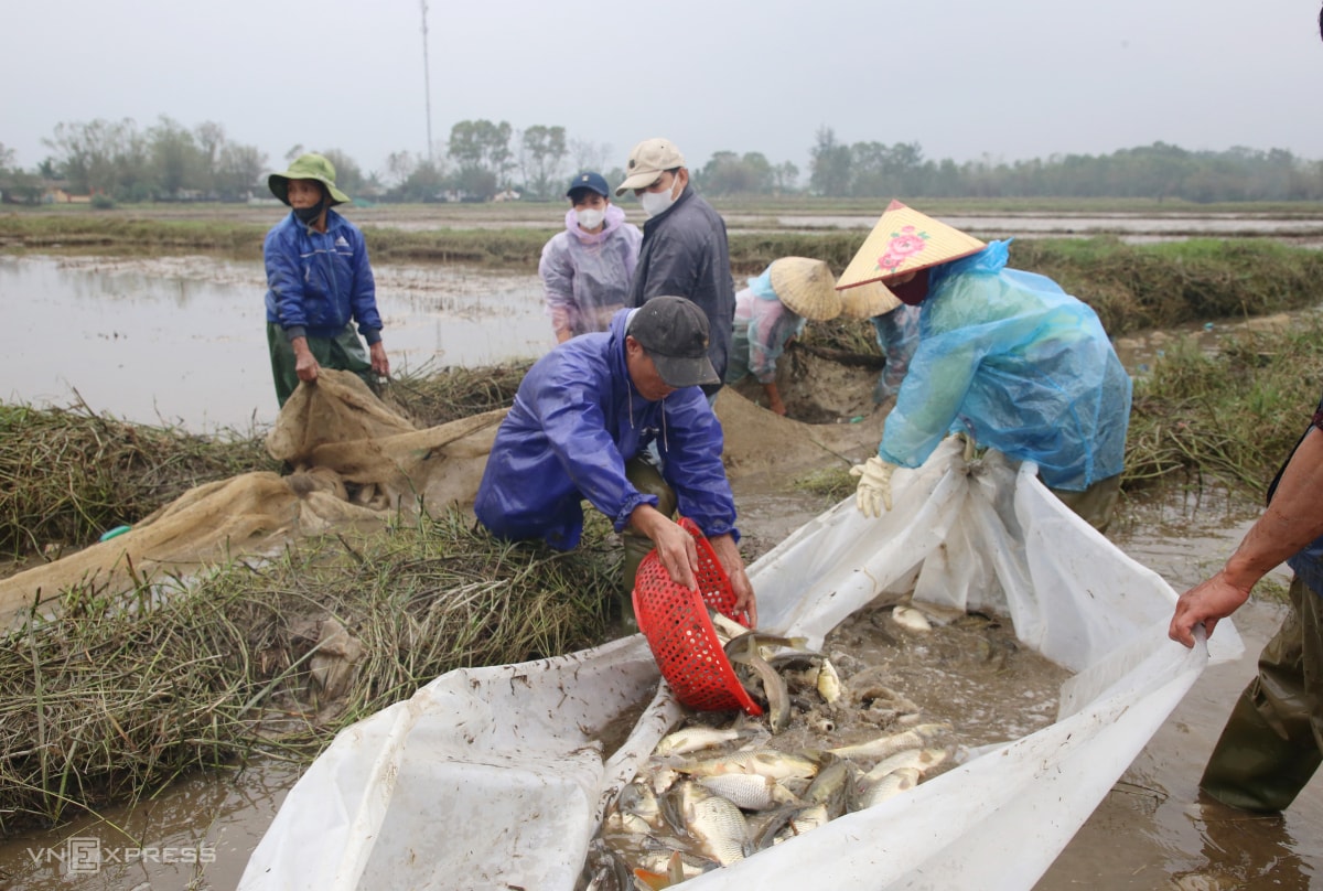 Để cá sống, họ cho vào tấm bạt chứa nước. Cá thu hoạch hầu hết được bán giống, vì kết thúc mùa mưa lũ, đầu ra cá giống ở Quảng Trị lớn.