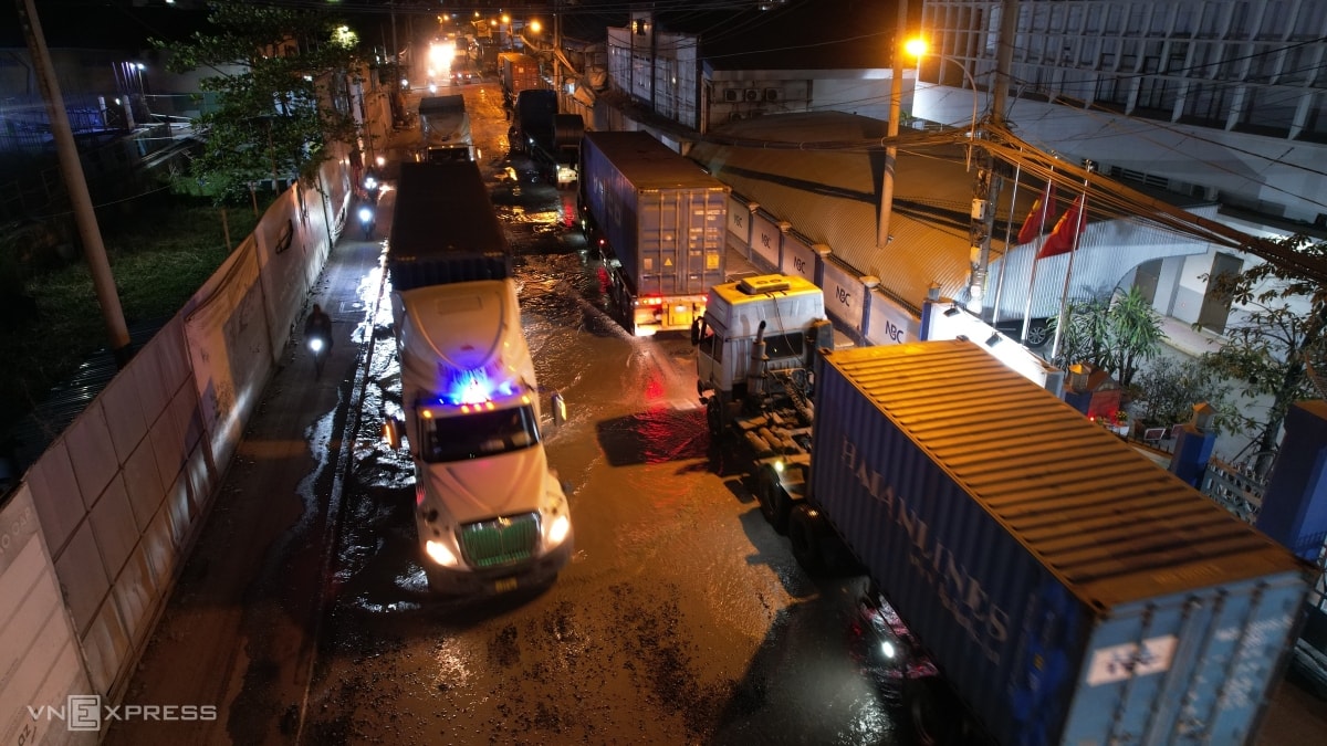 Đường ngập kéo dài khiến tuyến giao thông huyết mạch ở khu vực khu chế xuất ùn tắc cả sáng lẫn đêm.