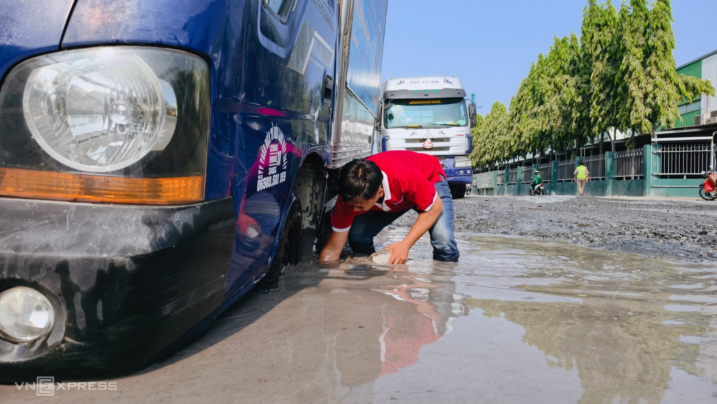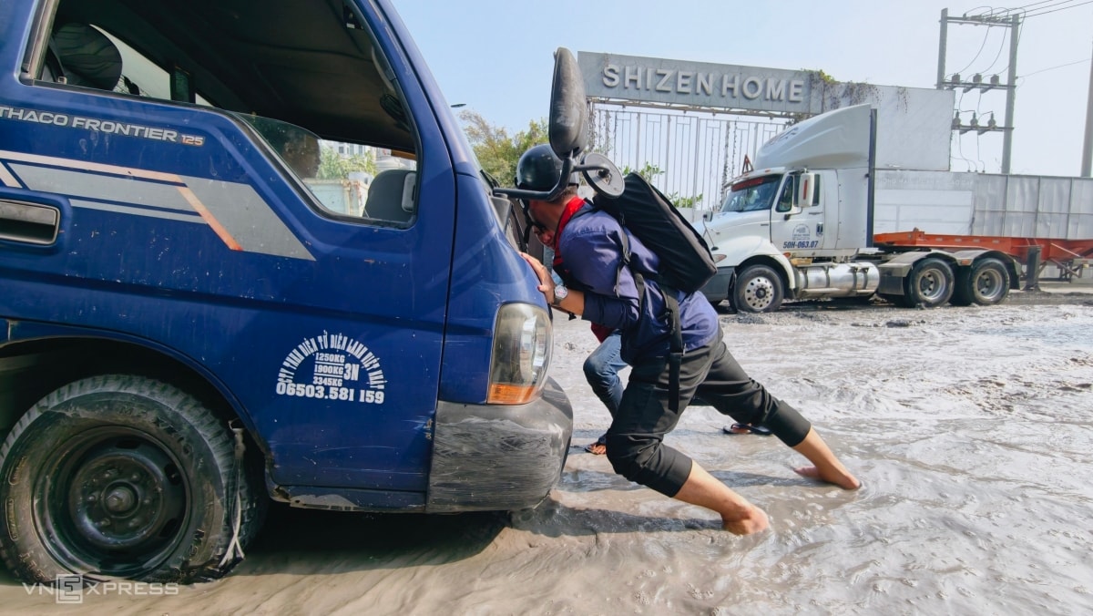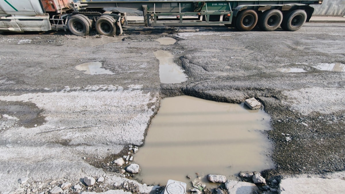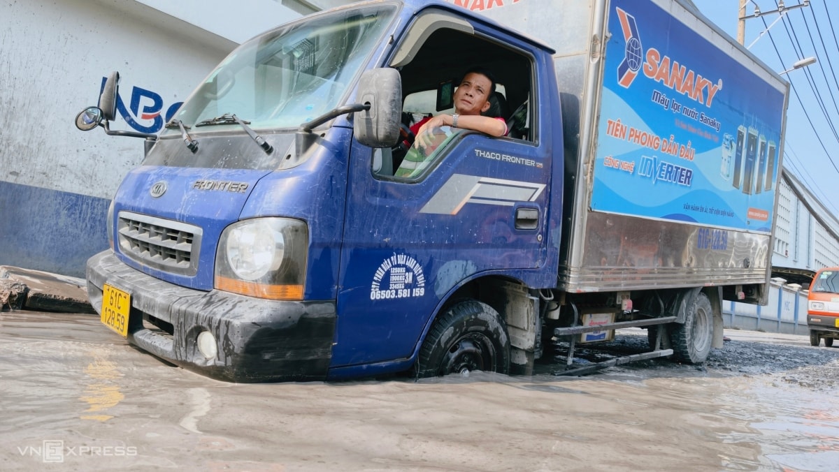 Tại một số đoạn hố sâu đến nửa bánh xe. Khi phương tiện chạy qua sụp xuống, nước văng tung toé.