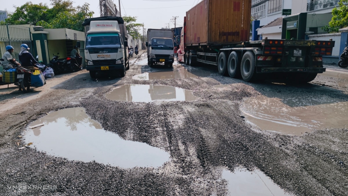Đoạn đường 2 km dẫn vào khu chế xuất Tân Thuận (quận 7 cũ) chi chít hố sâu khiến nhiều xe mắc kẹt, ùn tắc từ sáng đến tối, bụi mịt mù ảnh hưởng người dân.