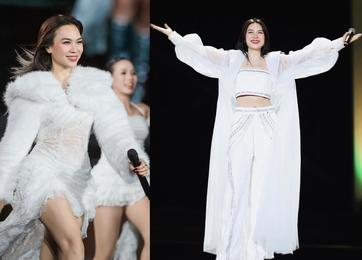 Mỹ Tâm diện váy ren xuyên thấu kết hợp áo blazer bằng lông trong show See The Light hồi tháng 12/2025 (trái). Trong show đón năm mới 2026, ca sĩ chọn crop-top phối quần ống loe tông trắng khoe eo thon. Hai mẫu trang phục đều là tông màu yêu thích của cô.