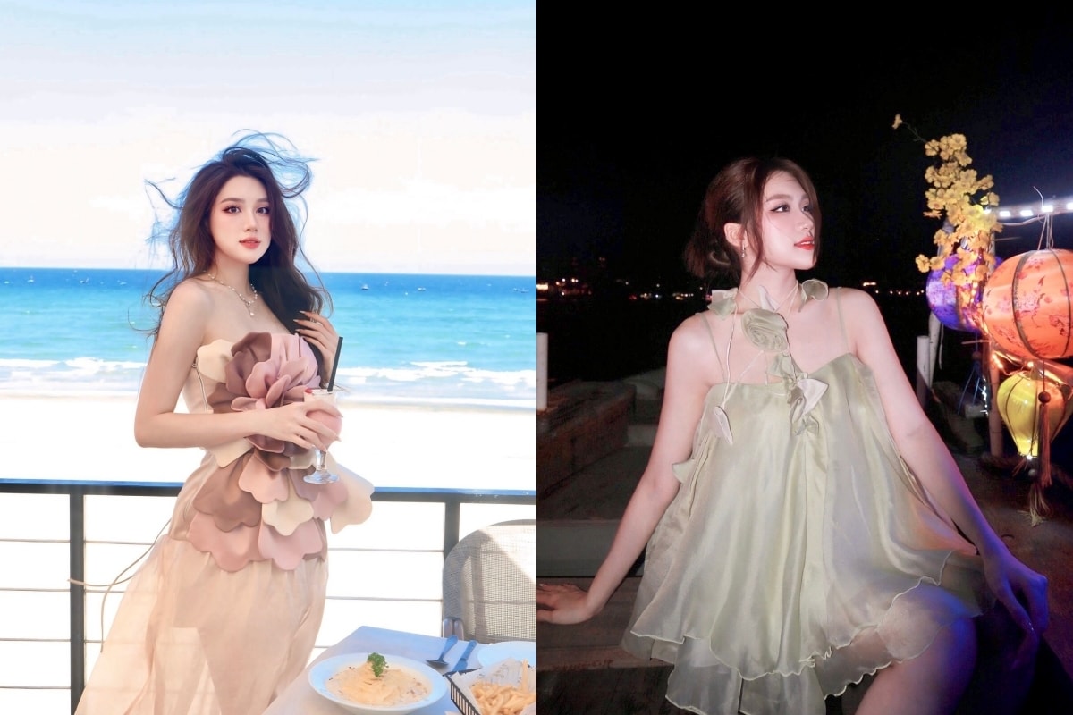 Váy voan xếp tầng, đính hoa là lựa chọn thường xuyên của Phương Oanh khi dạo phố hoặc nghỉ dưỡng.