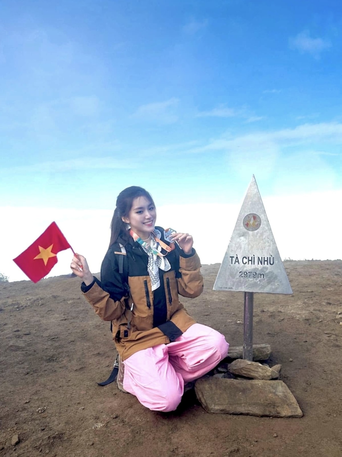 Phương Oanh trong một lần lên đỉnh Tà Chì Nhù - một trong 10 ngọn núi cao nhất Việt Nam, được mệnh danh là "thiên đường sân mây" ở Yên Bái.