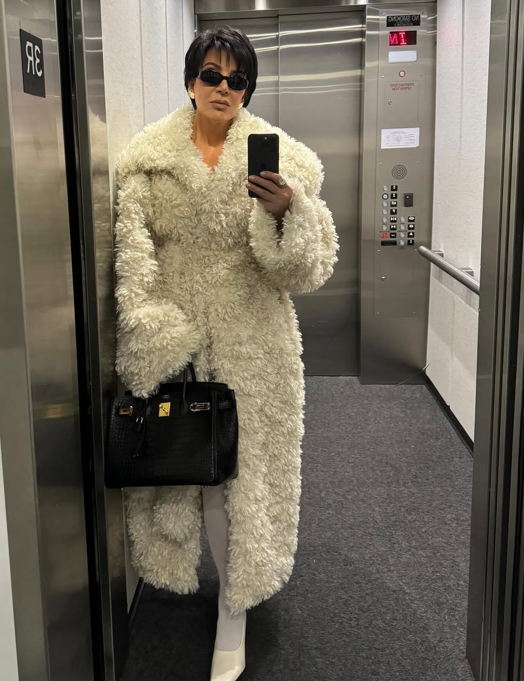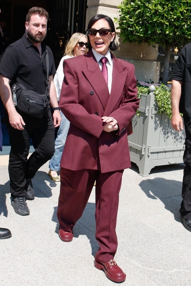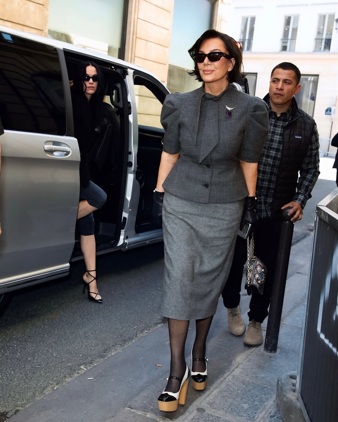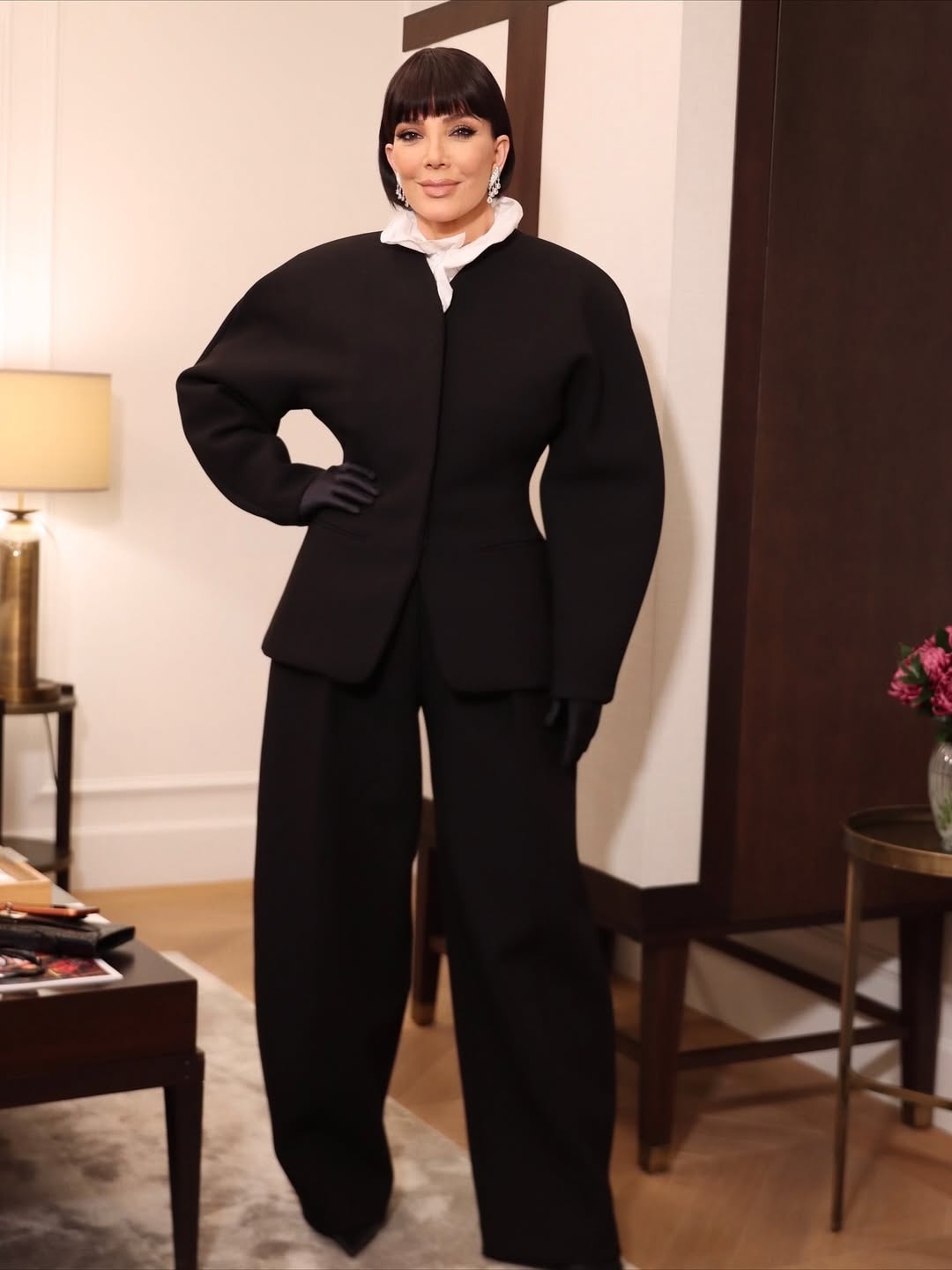 Kris Jenner diện áo vàng chanh của Givenchy theo mốt giấu quần, cùng Kim Kardashian dự buổi ra mắt phim All's Fair ở Los Angeles, tháng 10. Video: E!