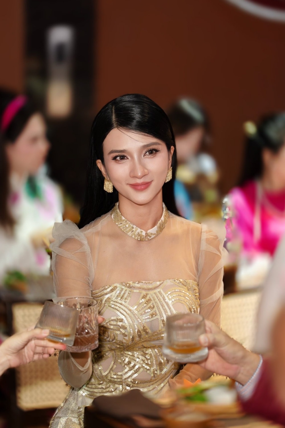 Nghệ sĩ Ưu tú Kim Tuyến, 38 tuổi, thường mặc các bộ đầm đơn sắc, kiểu dáng xuyên thấu dự sự kiện, tôn sắc vóc "gái một con".