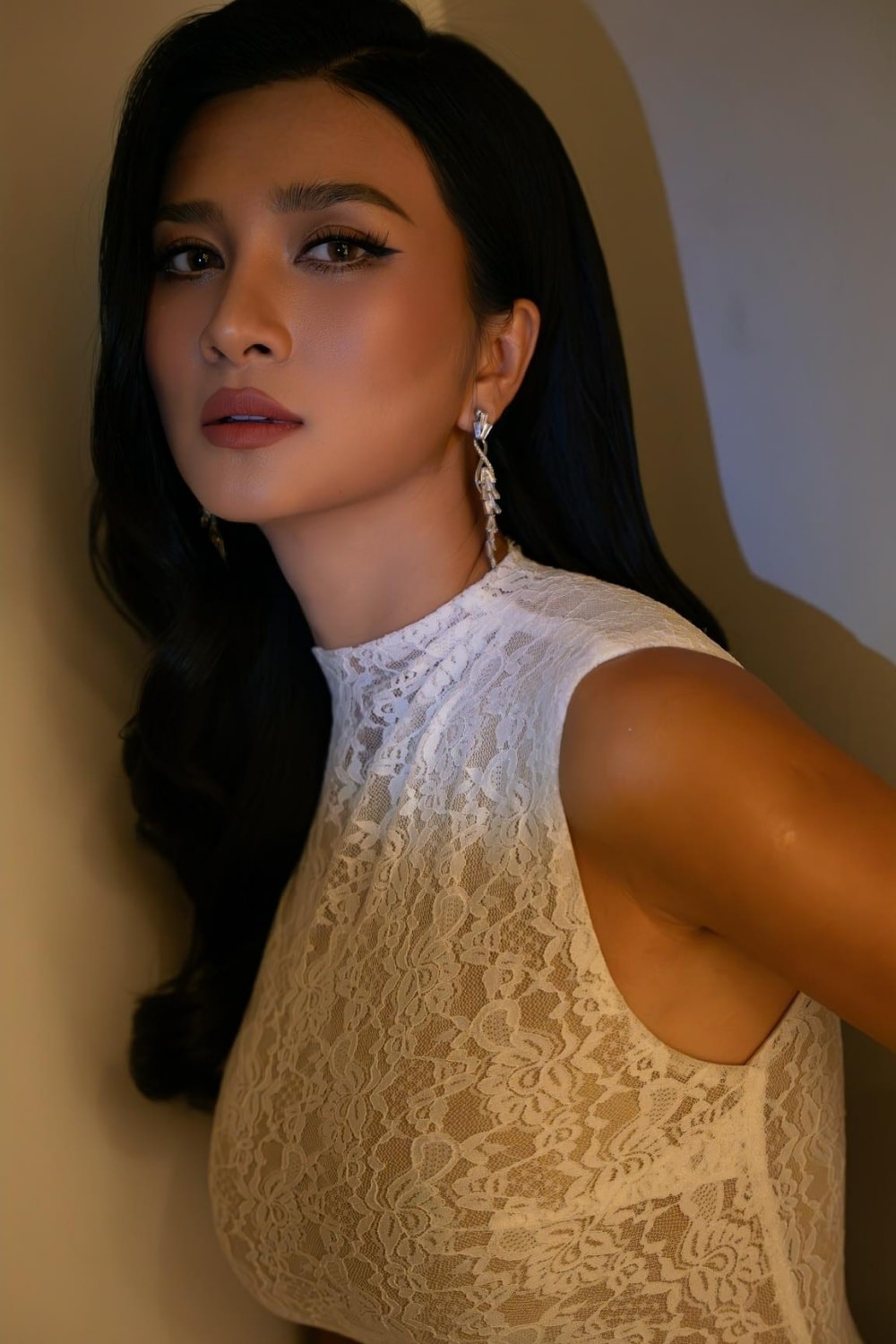 Cô trang điểm tông trầm với màu son đỏ đất, kẻ eyeliner và tạo độ sâu cho đôi mắt.