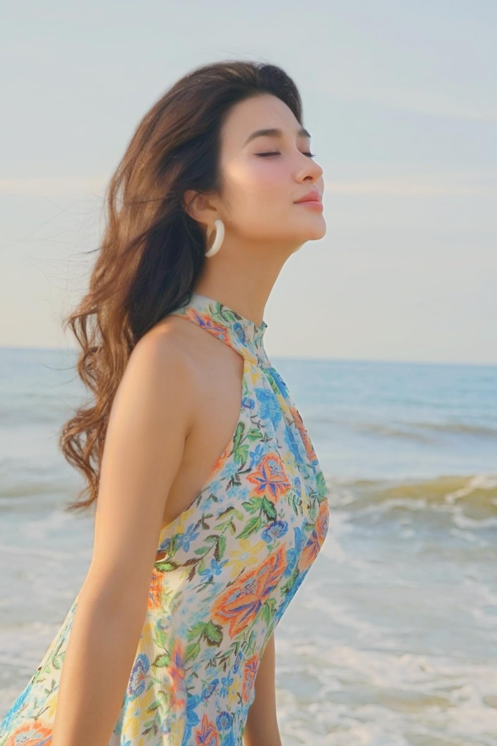 Diễn viên để tóc búi cao, xõa lọn hai bên mai khi chụp ảnh thời trang ở sân ga Metro, TP HCM.