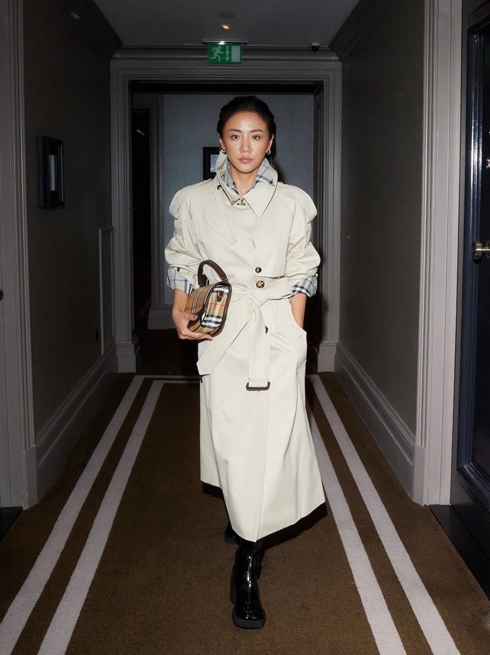 Văn Mai Hương dự London Fashion Week hồi tháng 9/2025. Cô chuẩn bị kỹ lưỡng về trang phục, lối makeup và kiểu tóc để phù hợp tinh thần nhà mốt. Ca sĩ diện trench coat biểu tượng của Burberry, phối boots da cổ cao và túi Highlands Crossbody.