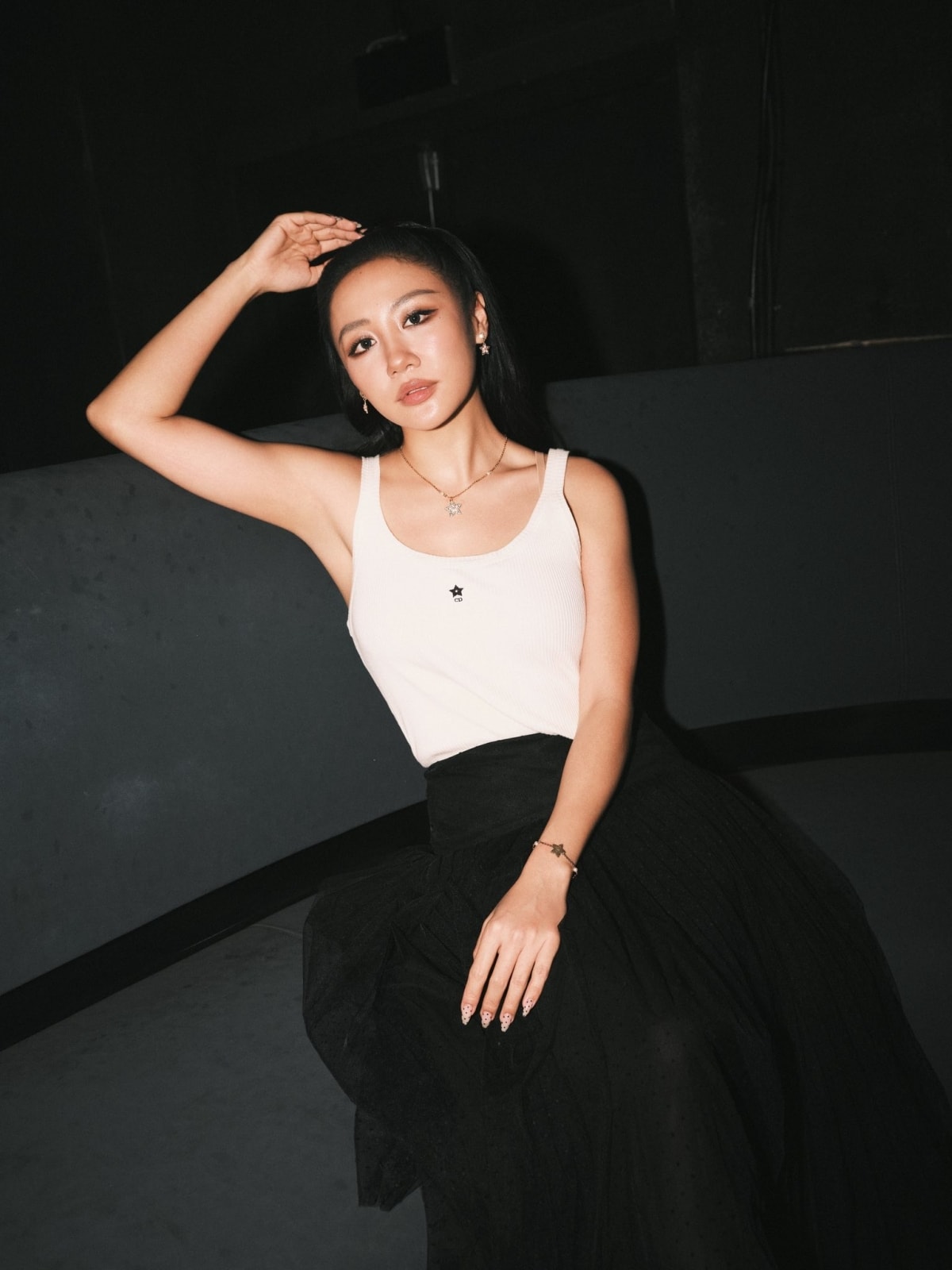 Giọng ca gốc Hà Nội chọn áo sát nách ôm dáng cùng chân váy đen phom xòe trong buổi ra mắt album Giai nhân cuối năm 2025. Cô cho biết tập yoga tại nhà để duy trì vóc dáng, sự dẻo dai.