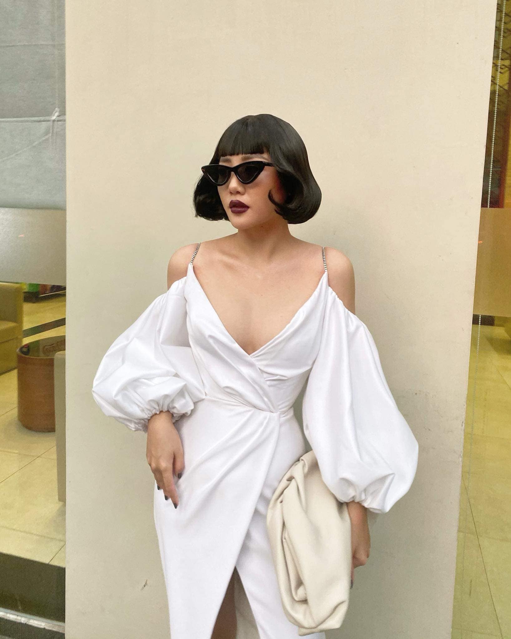 Văn Mai Hương thử nghiệm trang phục gợi cảm với đầm cúp ngực, xẻ tà, cut out, trang điểm đậm nhấn vào môi và mắt.