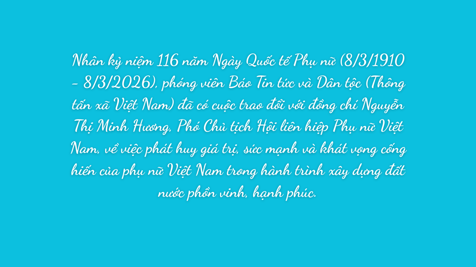Nhân kỷ niệm 116 năm Ngày Quốc tế Phụ nữ (8/3/1910 - 8/3/2026), phóng viên Báo Tin tức và Dân tộc (Thông tấn xã Việt Nam) đã có cuộc trao đổi với đồng chí Nguyễn Thị Minh Hương, Phó Chủ tịch Hội liên hiệp Phụ nữ Việt Nam, về việc phát huy giá trị, sức mạnh và khát vọng cống hiến của phụ nữ Việt Nam trong hành trình xây dựng đất nước phồn vinh, hạnh phúc.