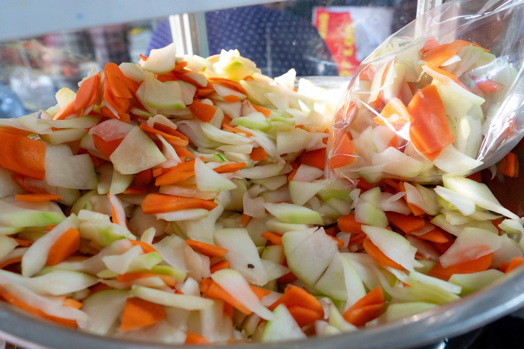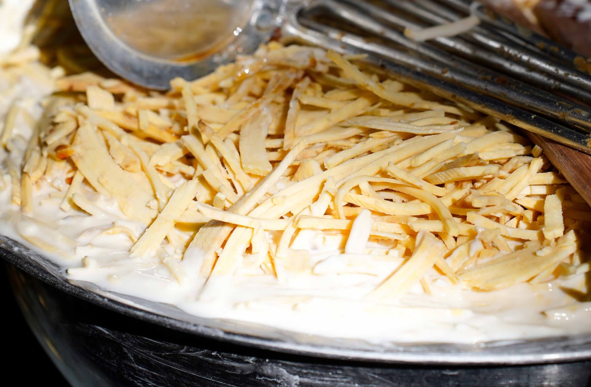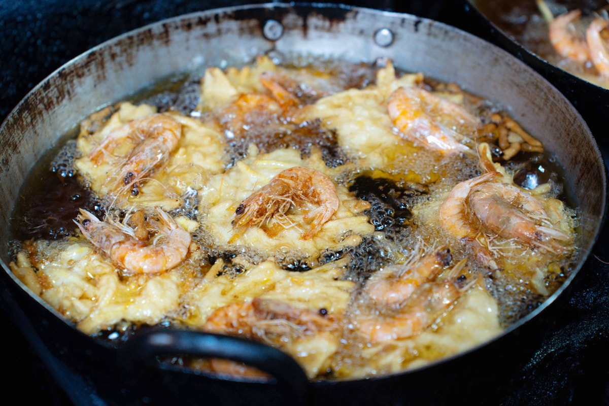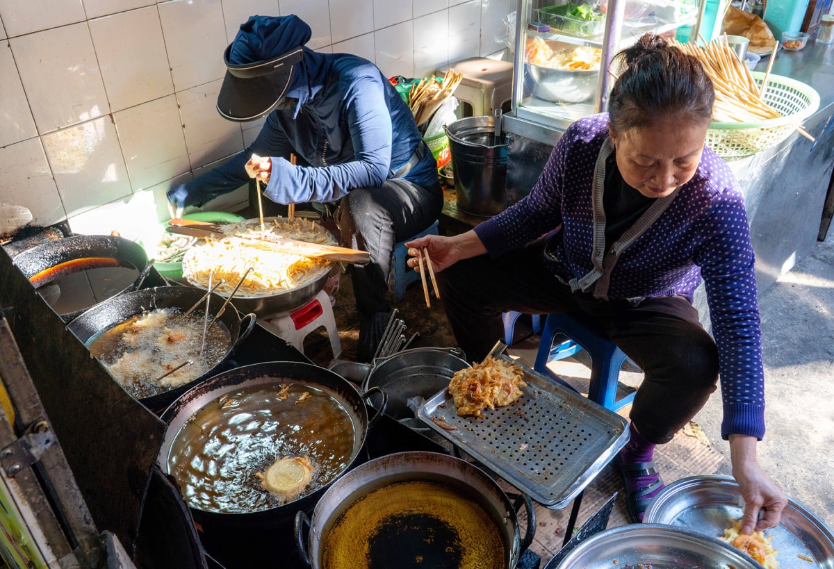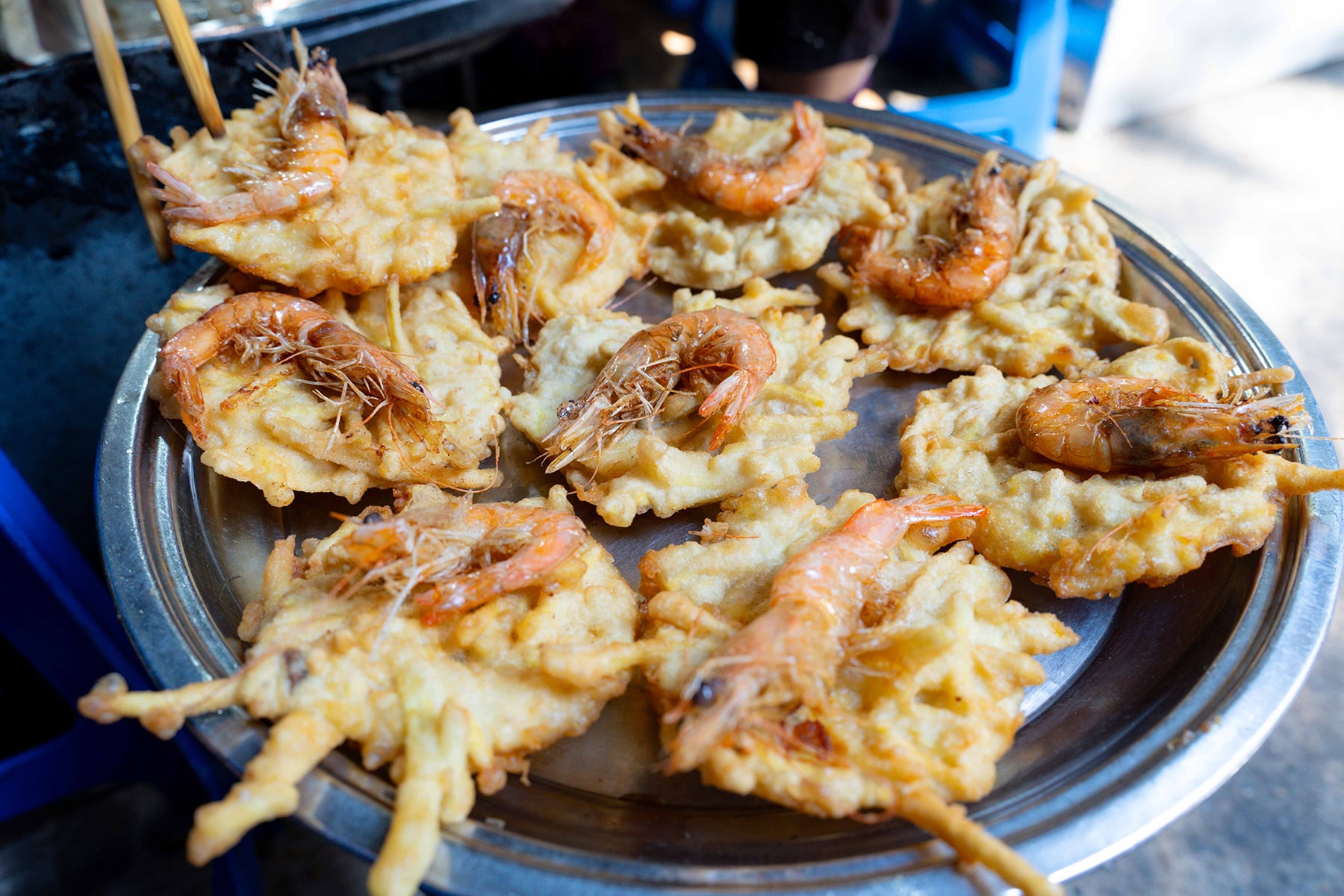 Bánh tôm Cô Ầm ở ngõ chợ Đồng Xuân được làm theo công thức truyền thống từ năm 1985 đến nay gồm bột, khoai lang, tôm tươi, chủ quán bán 700 chiếc mỗi ngày.
