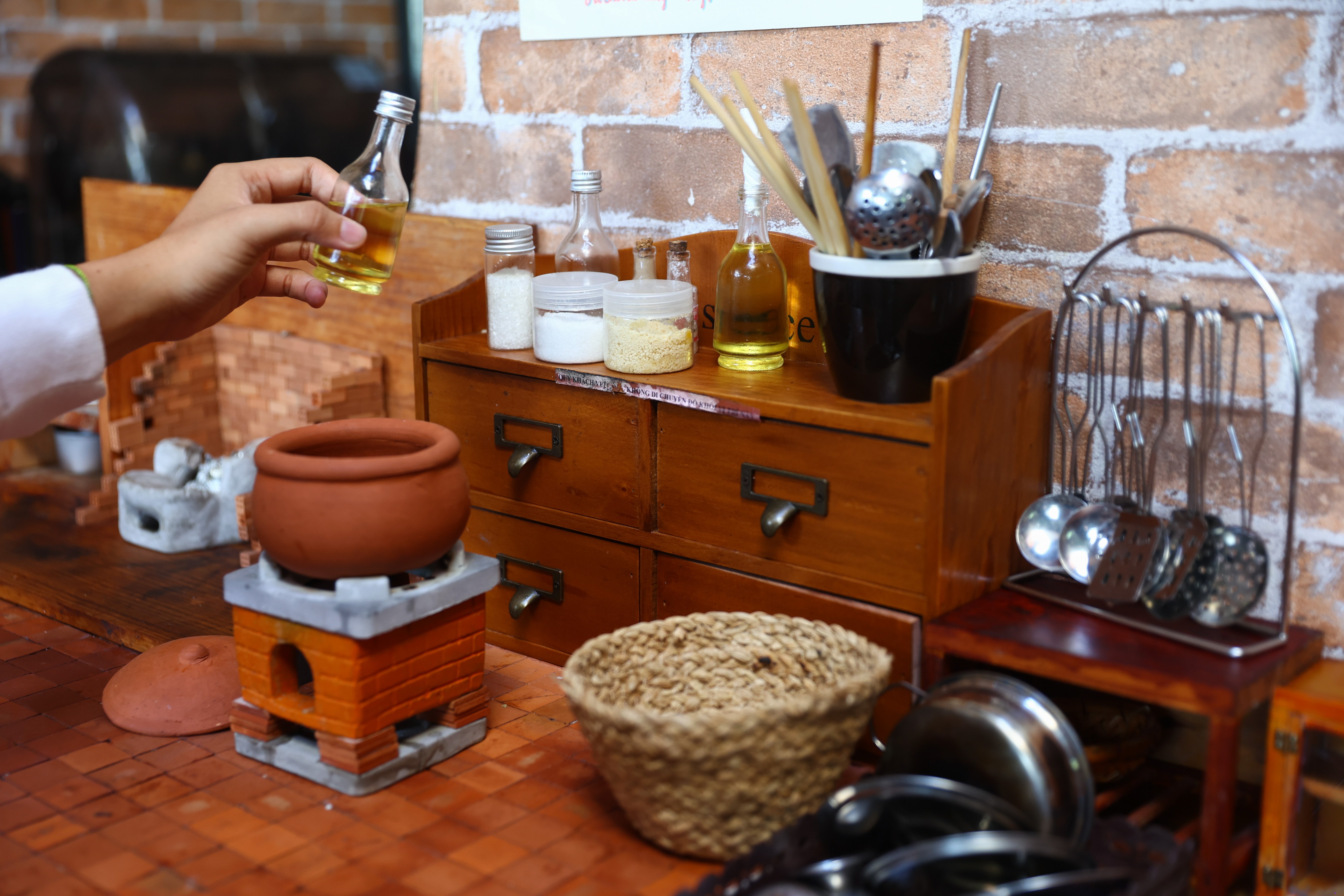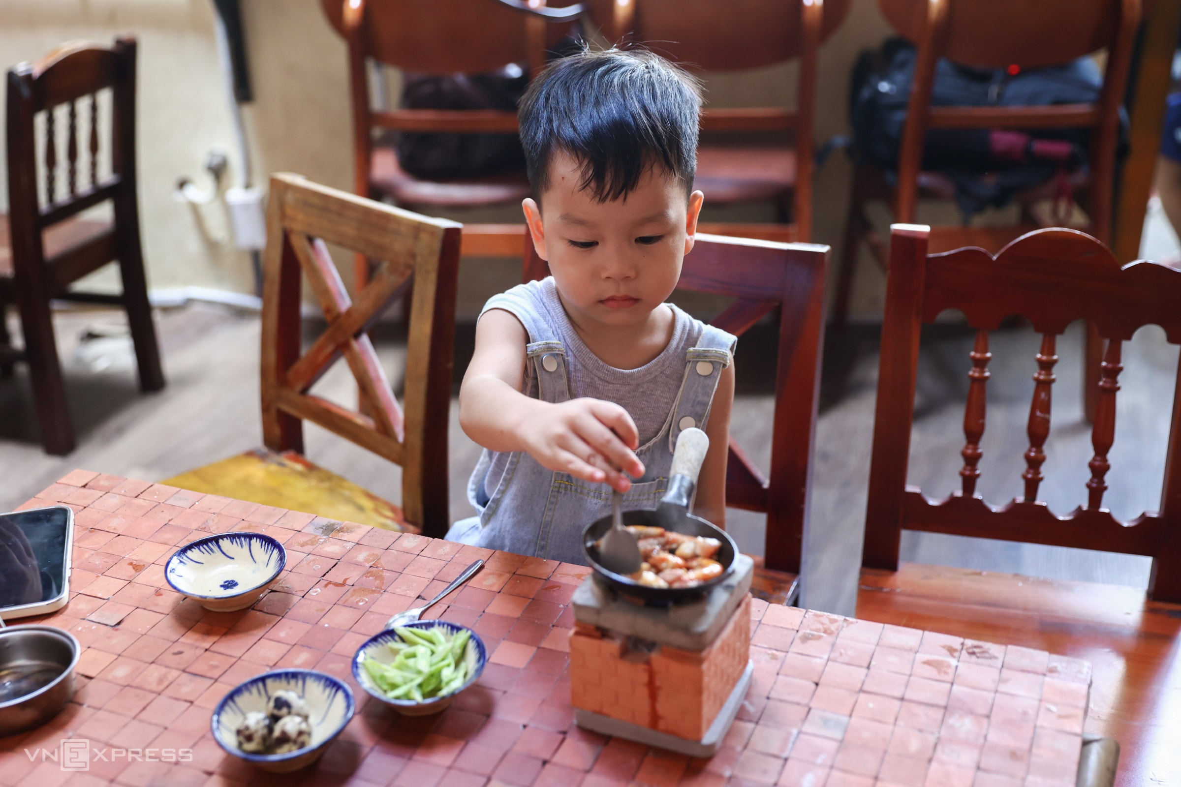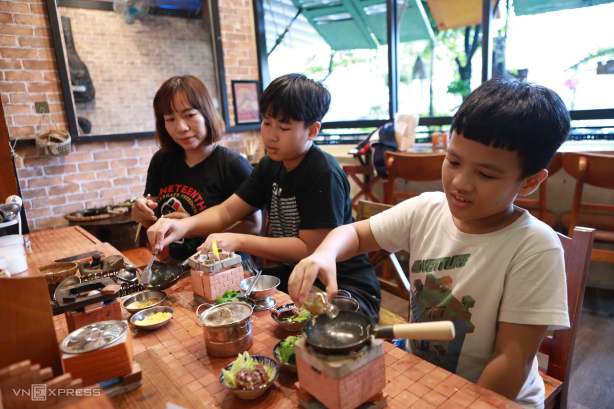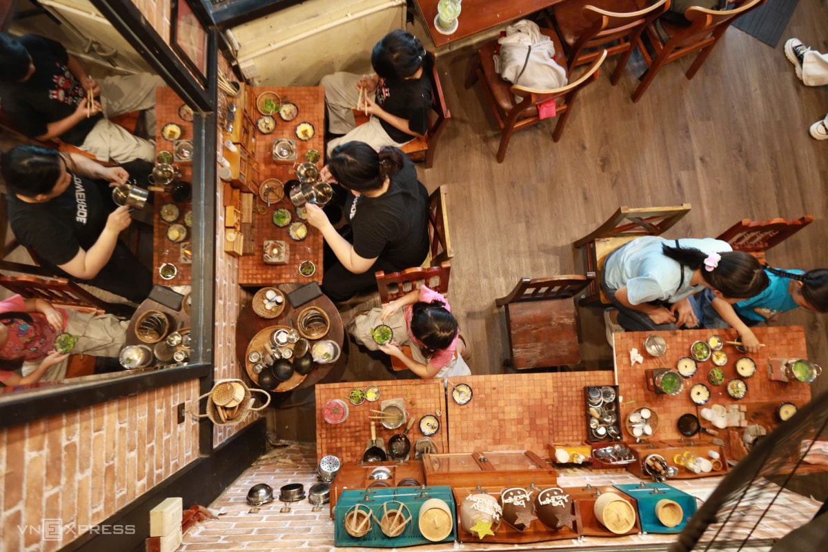 Quán nằm trên đường Nguyễn Xí, thiết kế căn bếp cho khách trải nghiệm nấu ăn bằng các vật dụng tí hon, thu hút nhiều trẻ em trải nghiệm.