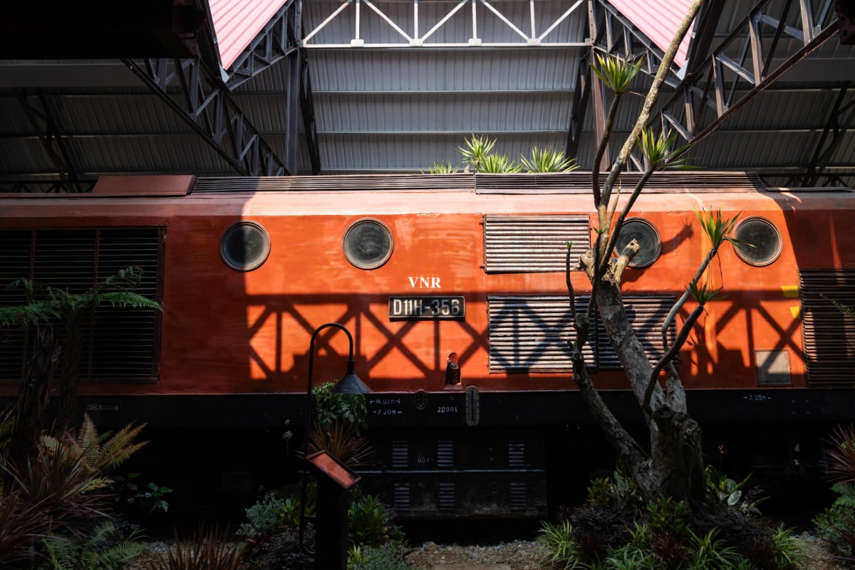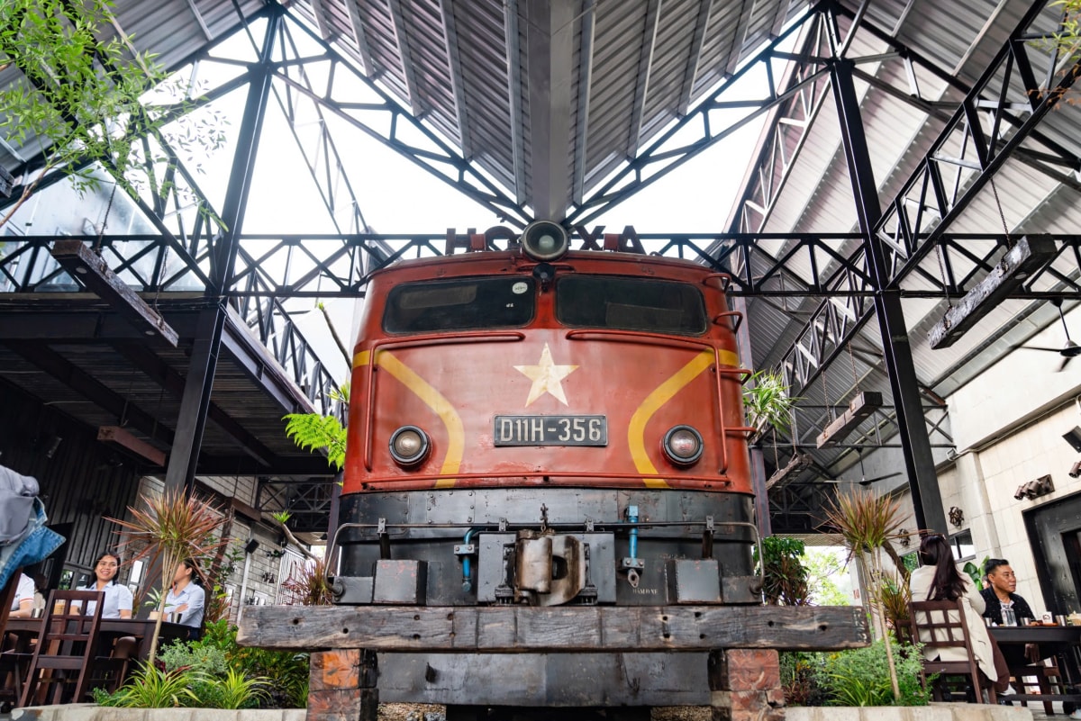 Điểm nhấn tại quán là mô hình đầu tàu 50 năm tuổi được phục hồi và trưng bày ở trung tâm.