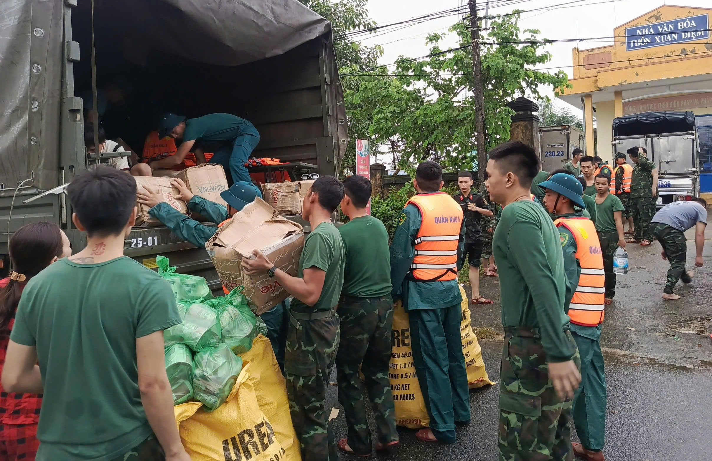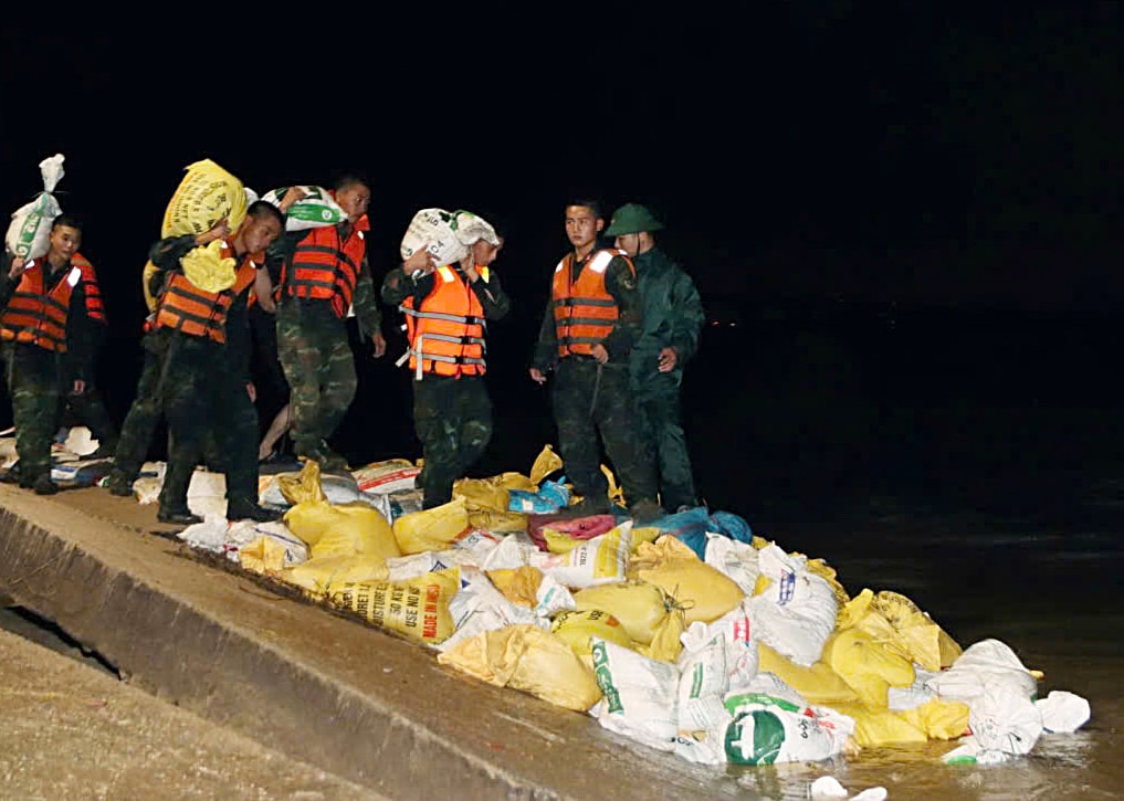 Những ngày qua, hàng nghìn cán bộ, chiến sĩ vận chuyển hàng hóa, lương thực, nước uống đến người dân vùng ngập sâu và tham gia đắp đê, gia cố tuyến xung yếu.