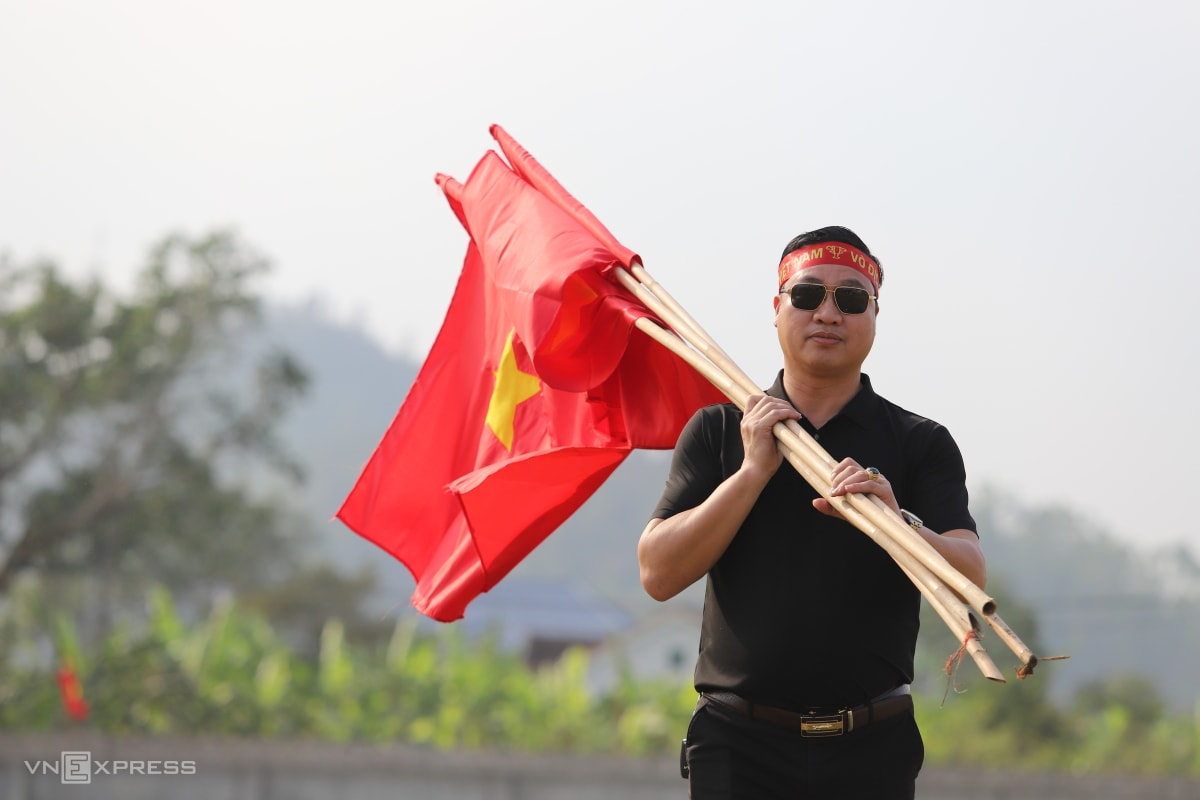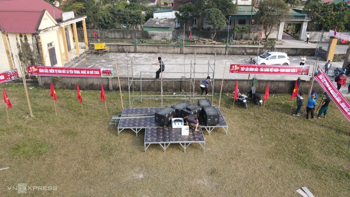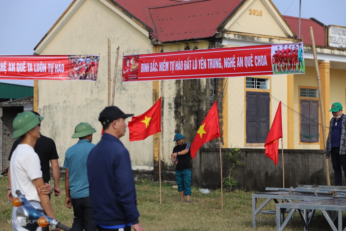 Từ đầu giờ chiều 20/1, sân vận động xóm Hưng Yên Bắc 2, xã Yên Trung, trước đây thuộc huyện Hưng Nguyên, phủ kín cờ đỏ sao vàng. Hàng chục người tất bật chuẩn bị cổ vũ đội Việt Nam đấu Trung Quốc ở bán kết U23 châu Á lúc 22h30.