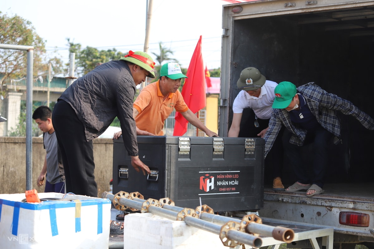 Loa máy được Ban tổ chức thuê từ các rạp cưới vận chuyển tới sân vận động.