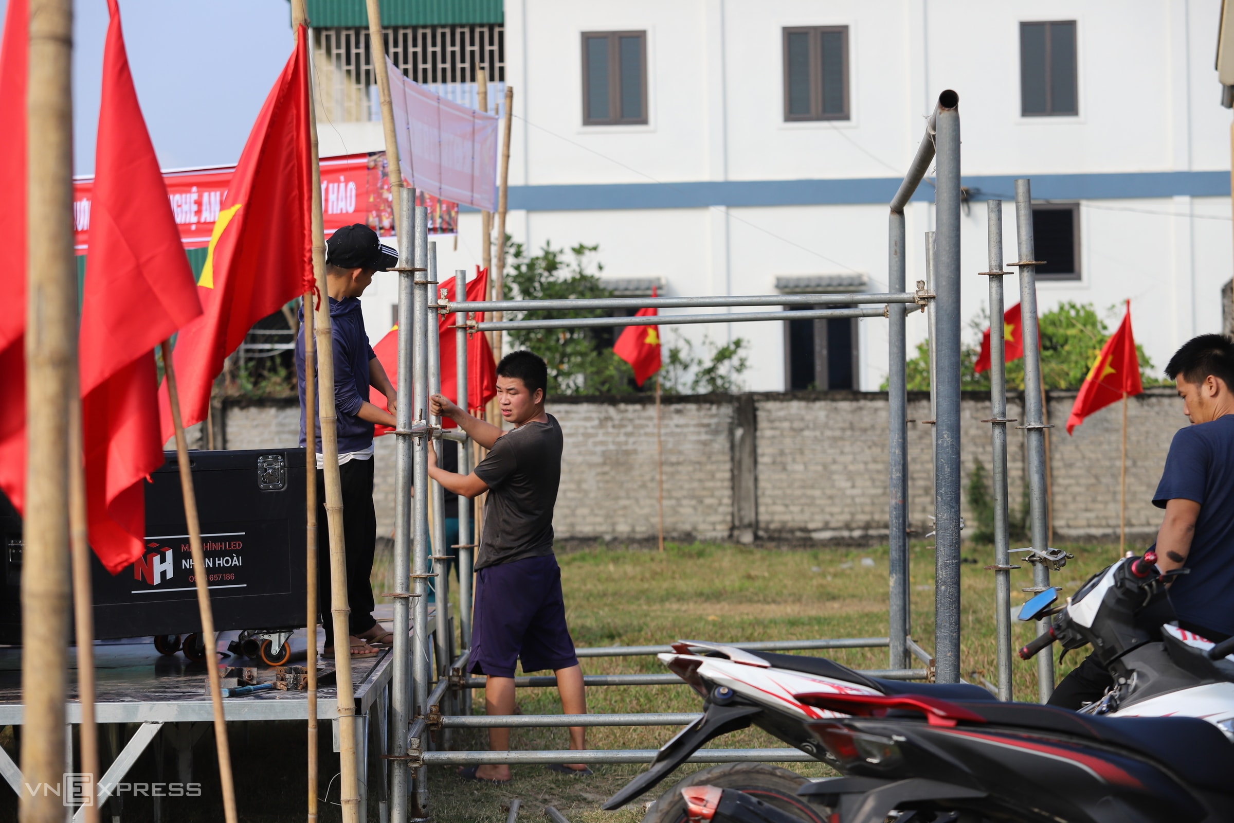 Trong 3-4 tiếng chiều nay, hàng chục người tham gia dựng khung để lắp màn hình Led cỡ lớn và bố trí hệ thống loa đài.