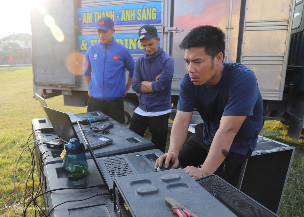 Đến khoàng 17h, sân khấu với màn hình Led cỡ lớn được dựng xong. Đội ngũ kỹ thuật được bố trí 3-4 người để xử lý các sự cố về mạng và điện trong trận đấu.