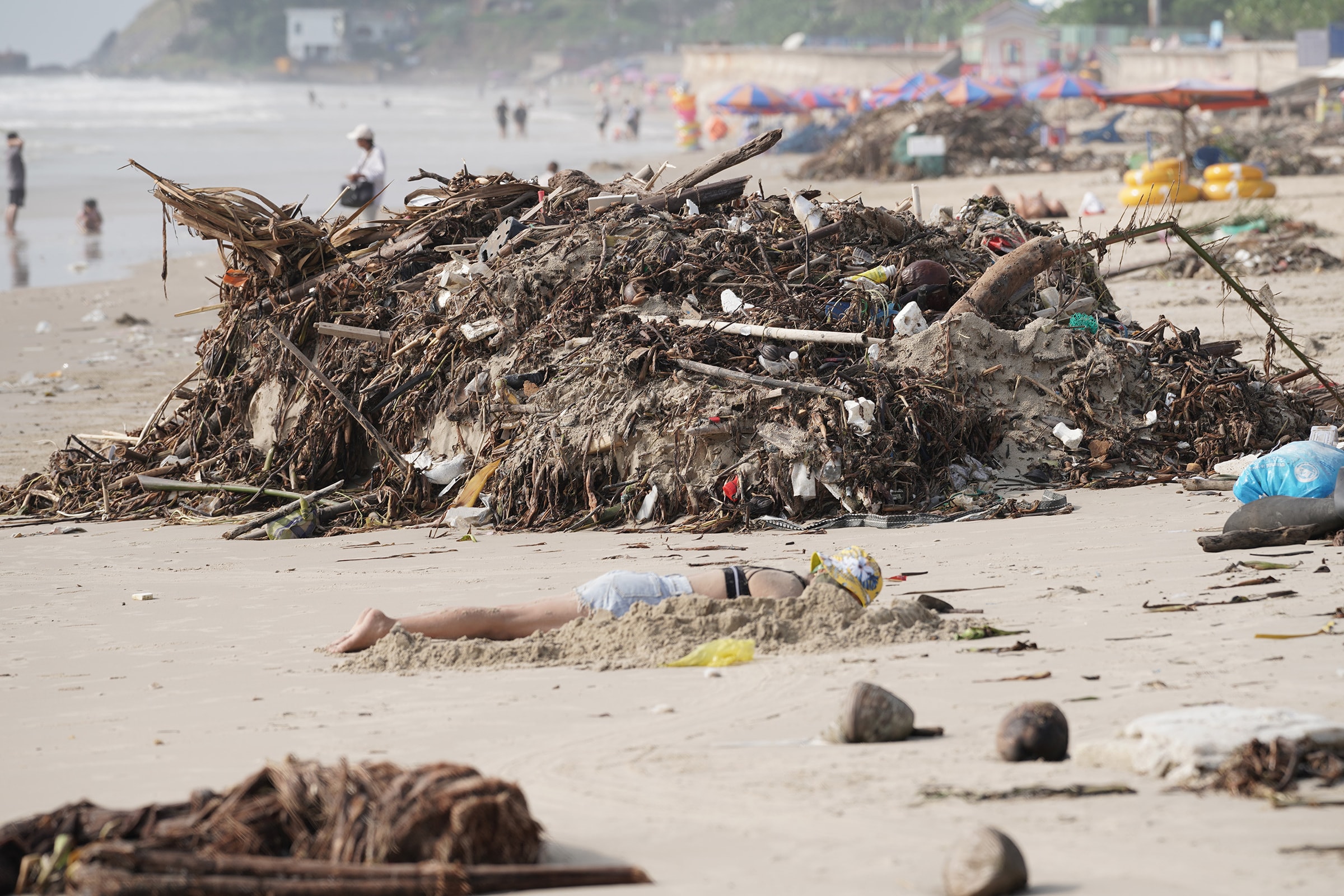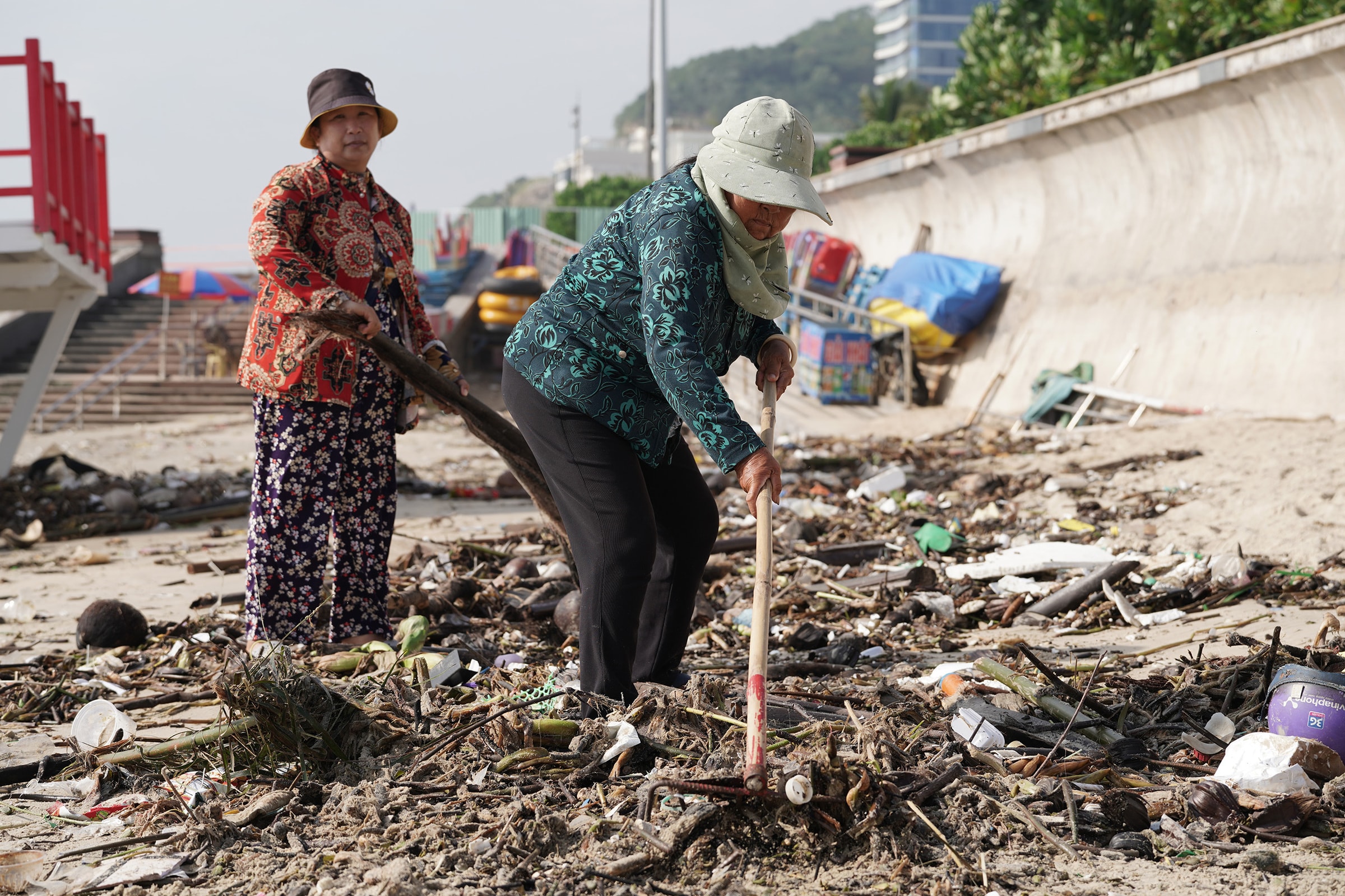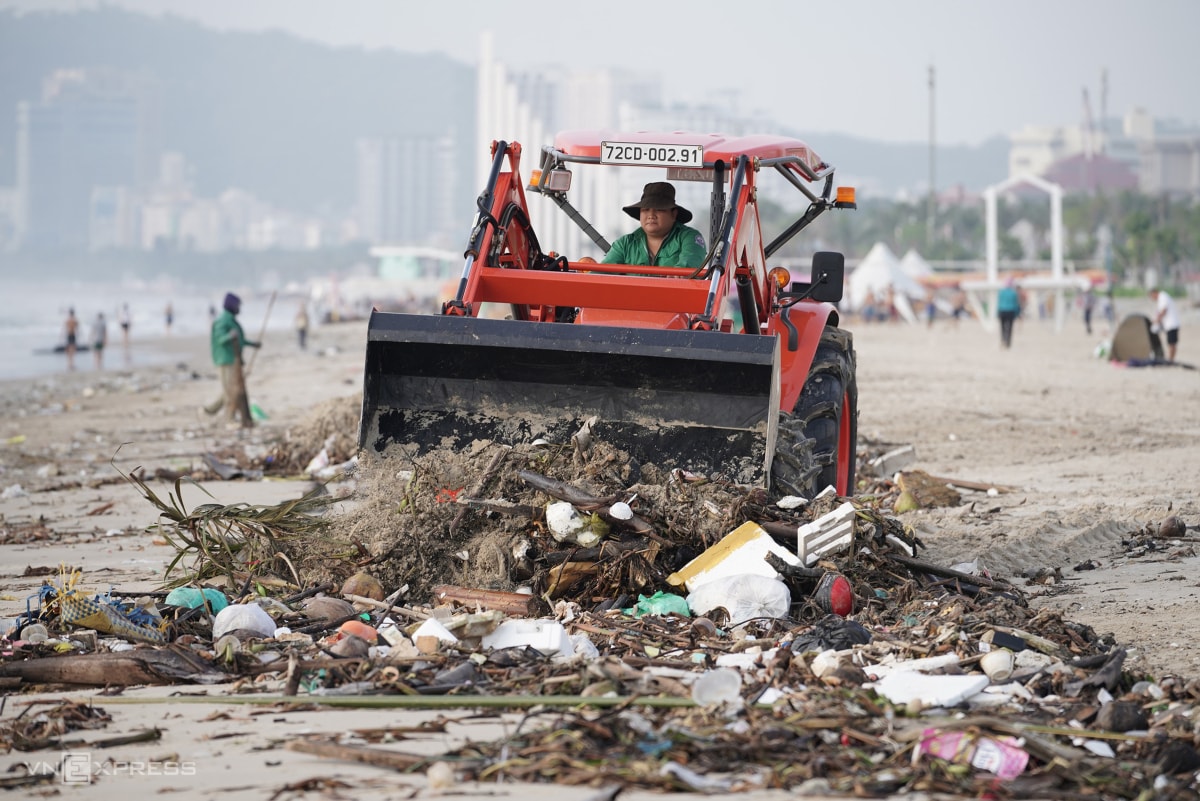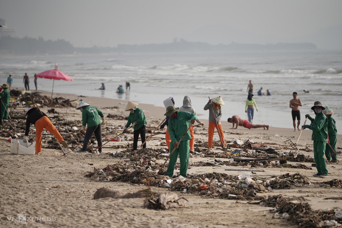 Hàng trăm tấn rác nhựa, lục bình và gốc cây trôi dạt phủ dày hơn 3 km bờ biển từ Bãi Sau đến tháp Tam Thắng, khiến công nhân phải gom thành từng đống vì không thể dọn kịp.