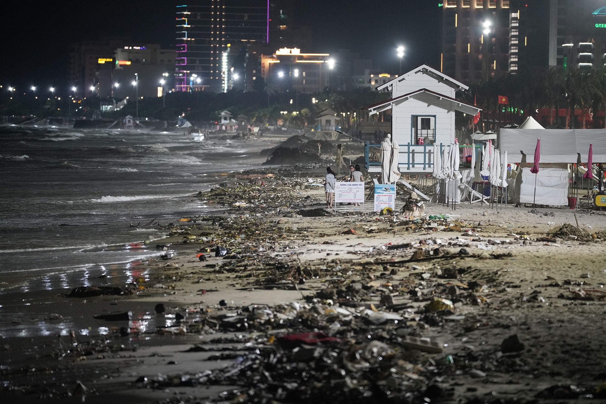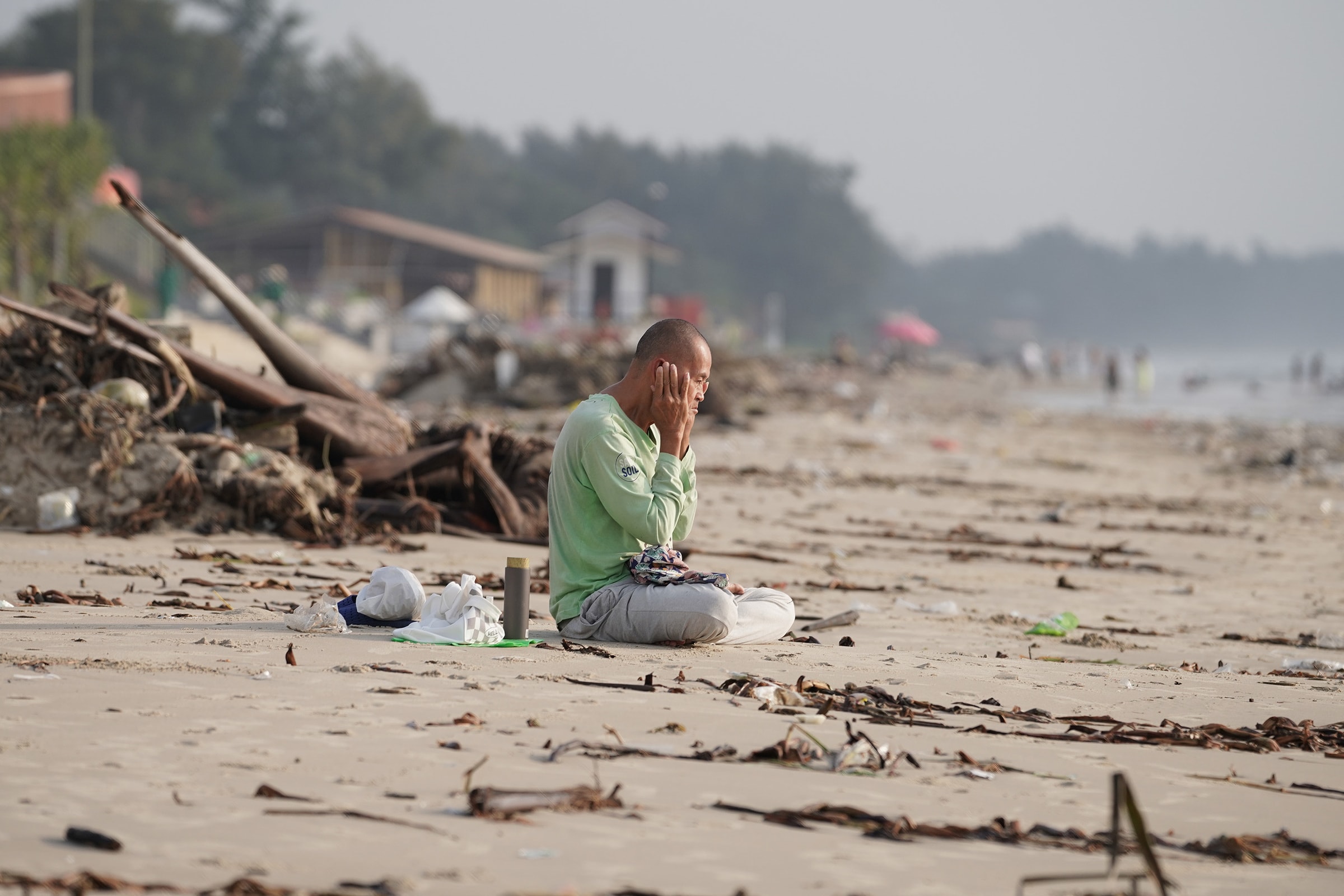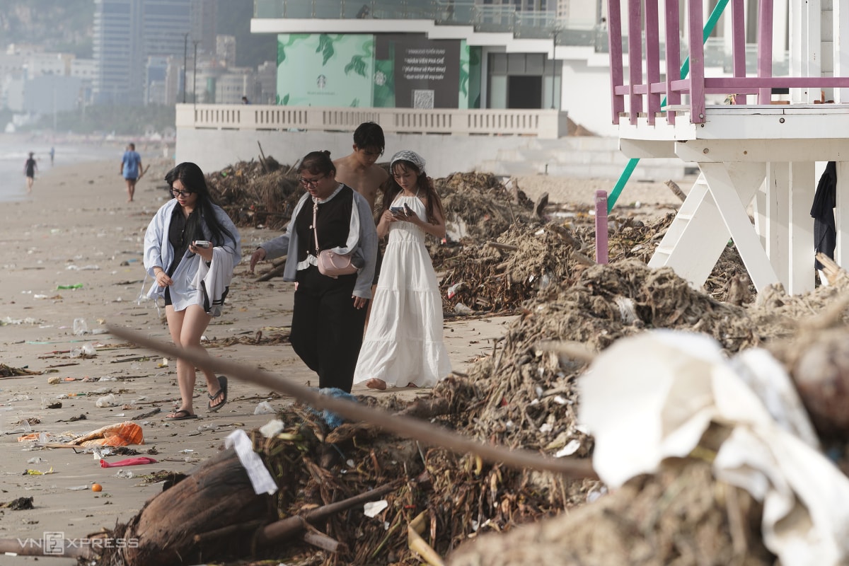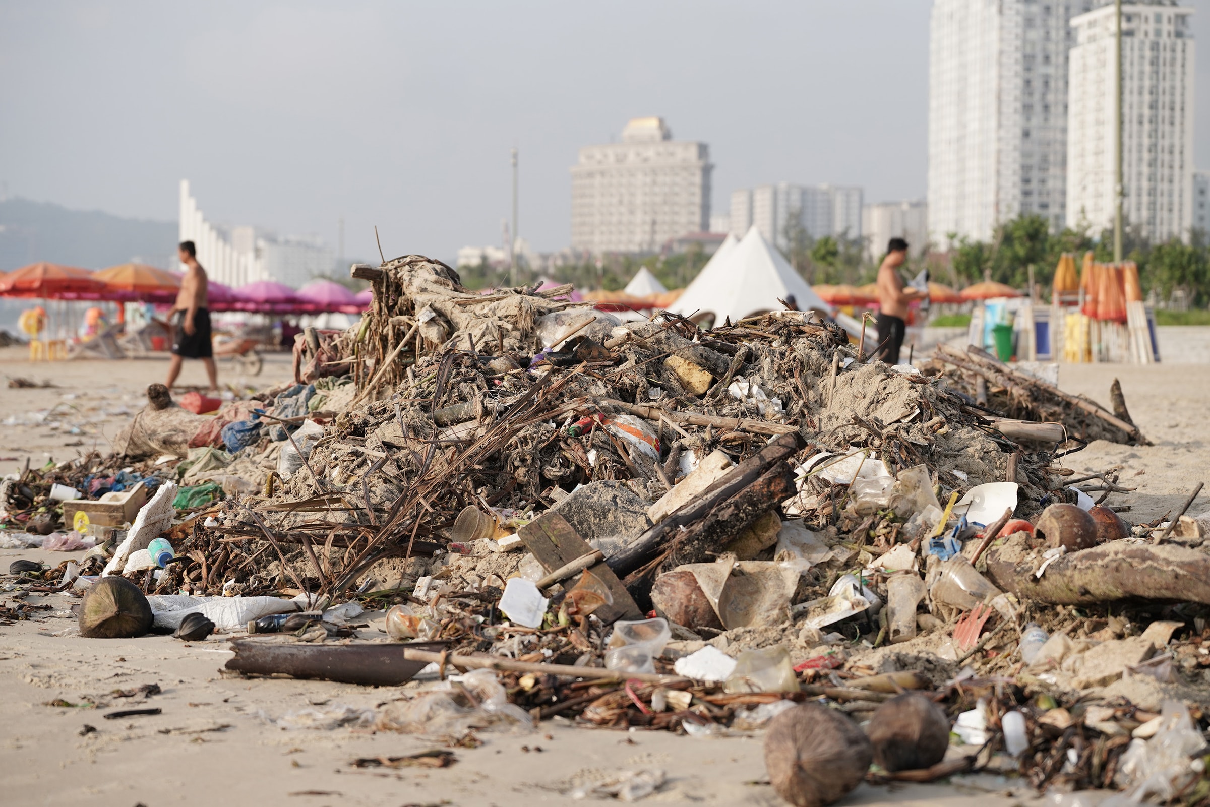 Hàng trăm tấn rác nhựa, lục bình và gốc cây trôi dạt phủ dày hơn 3 km bờ biển từ Bãi Sau đến tháp Tam Thắng, khiến công nhân phải gom thành từng đống vì không thể dọn kịp.