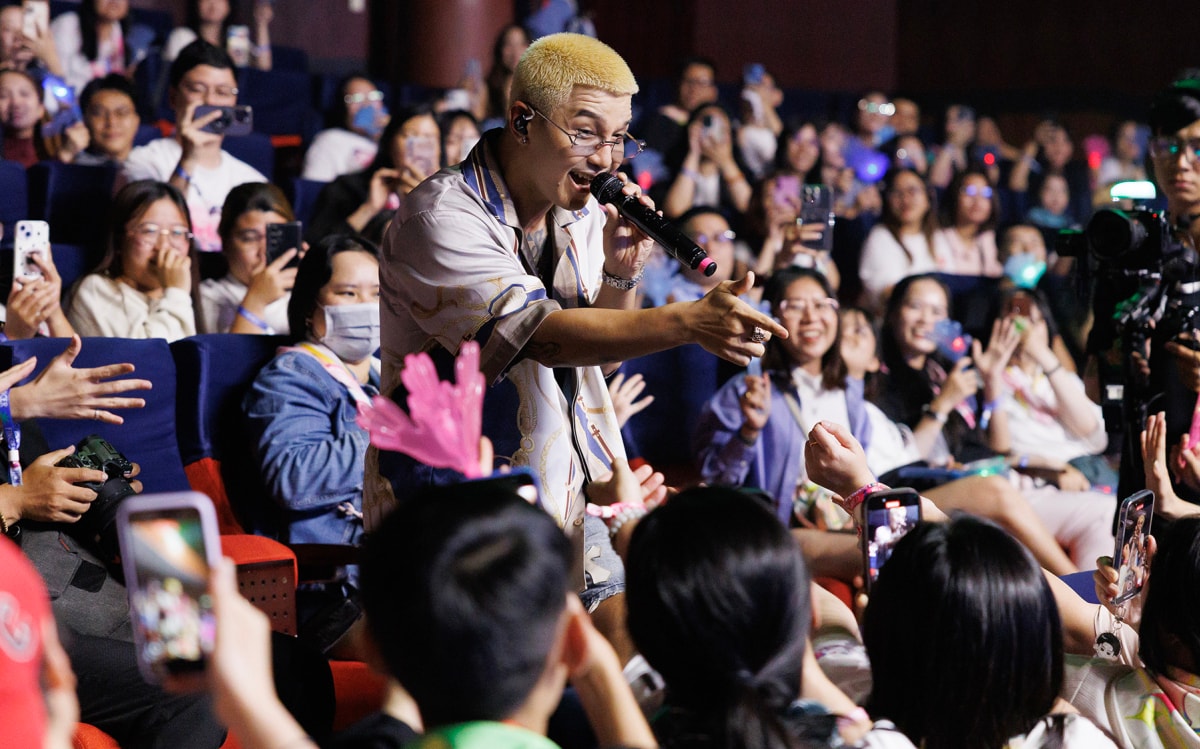 Theo yêu cầu từ fan, rapper thể hiện bản hit một thời Vui cùng Mr.Dee. Khán giả reo hò, hát theo giai điệu quen thuộc. Video: Hoàng Dung
