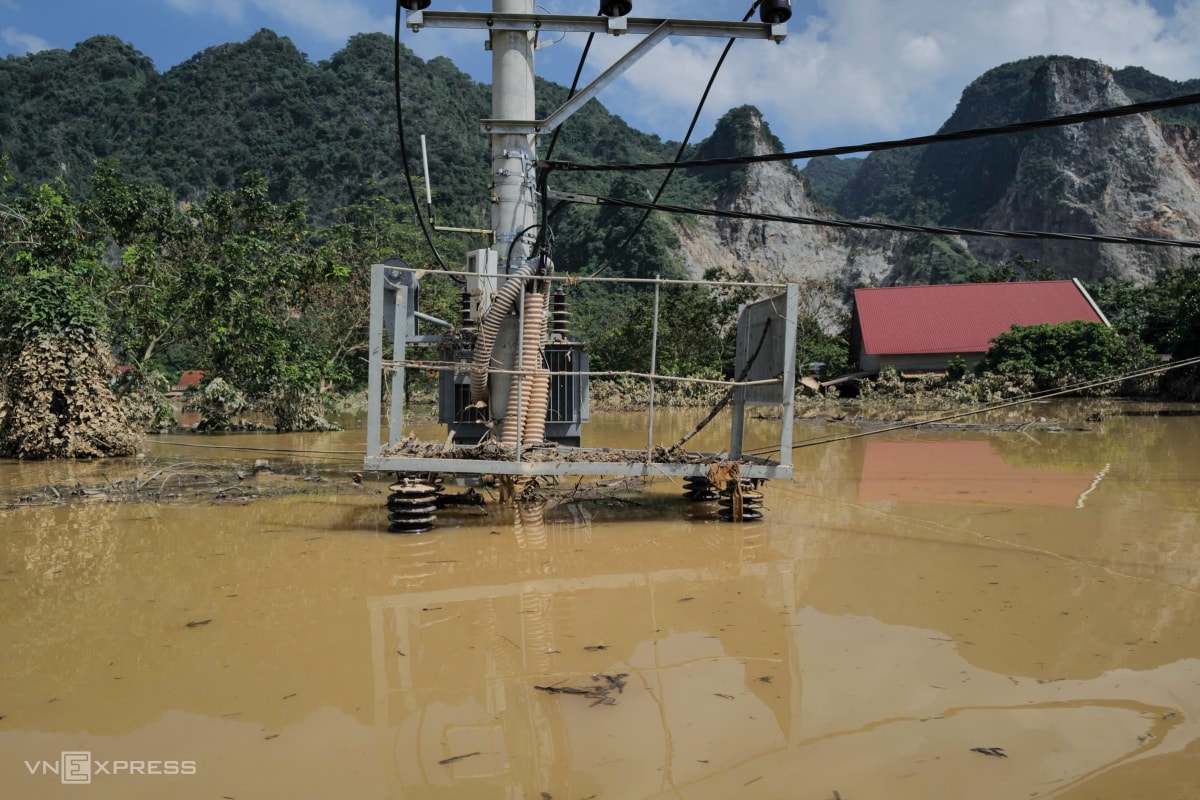 Trụ điện ở thôn Tự Nhiên ngập sâu khoảng 3 m. Đến nay, toàn thôn vẫn chưa có điện trở lại.