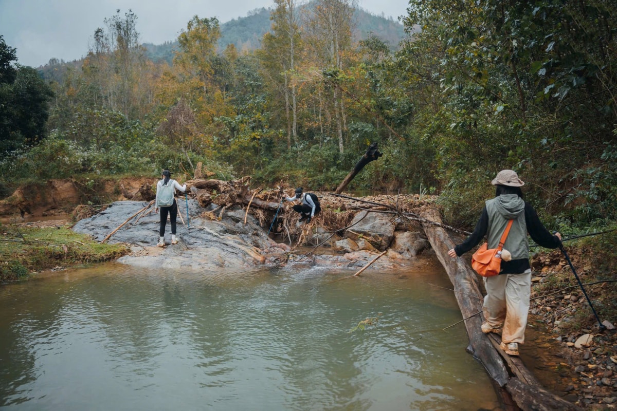 Hết đoạn đường mòn, địa hình chuyển sang dốc cao và suối. Bề mặt đá phủ rêu trơn trượt, nhiều đoạn suối chỉ có thân cây bắc ngang làm cầu, đòi hỏi du khách thận trọng. Gậy trekking là vật dụng cần thiết để giữ thăng bằng và đỡ mất sức.