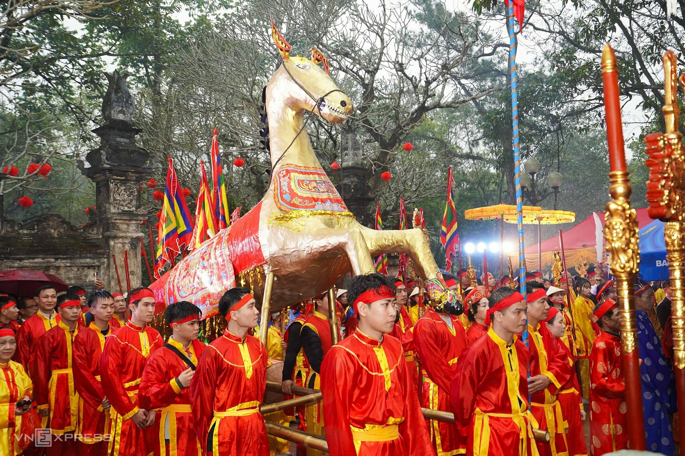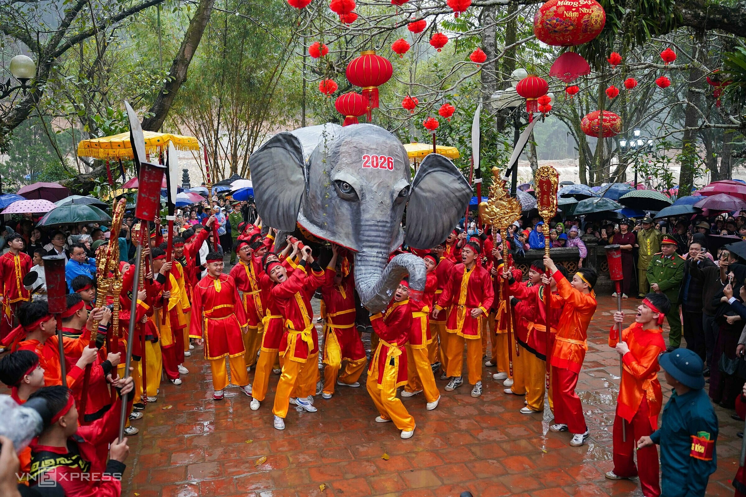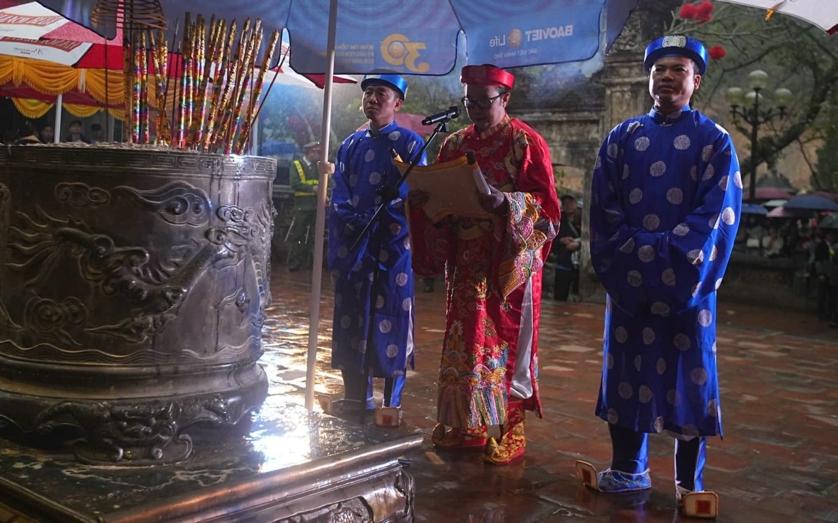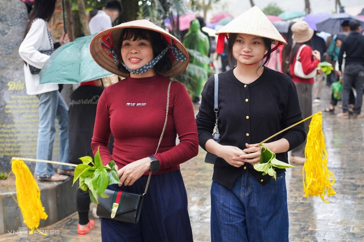Dù mưa phùn, nhiệt độ khoảng 22 độ C, các đoàn rước cùng đông đảo người dân vẫn tập trung về quần thể Đền Sóc dự lễ.