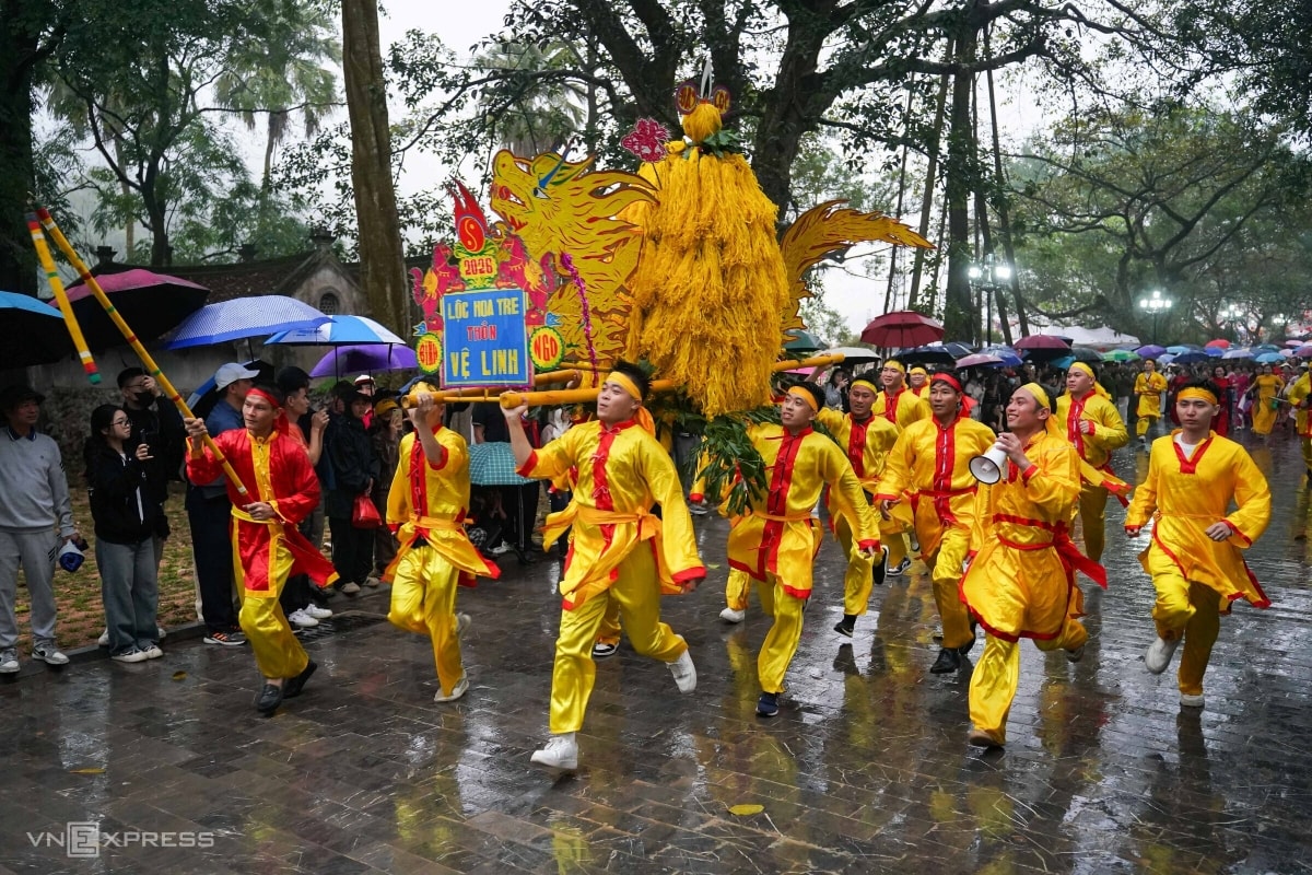 Từ mờ sáng mùng 6 Tết, người dân Sóc Sơn và Đa Phúc đội mưa rước kiệu nữ tướng, kiệu hoa tre, kiệu Gióng, voi và hoa cau trong lễ hội Gióng đầu xuân.