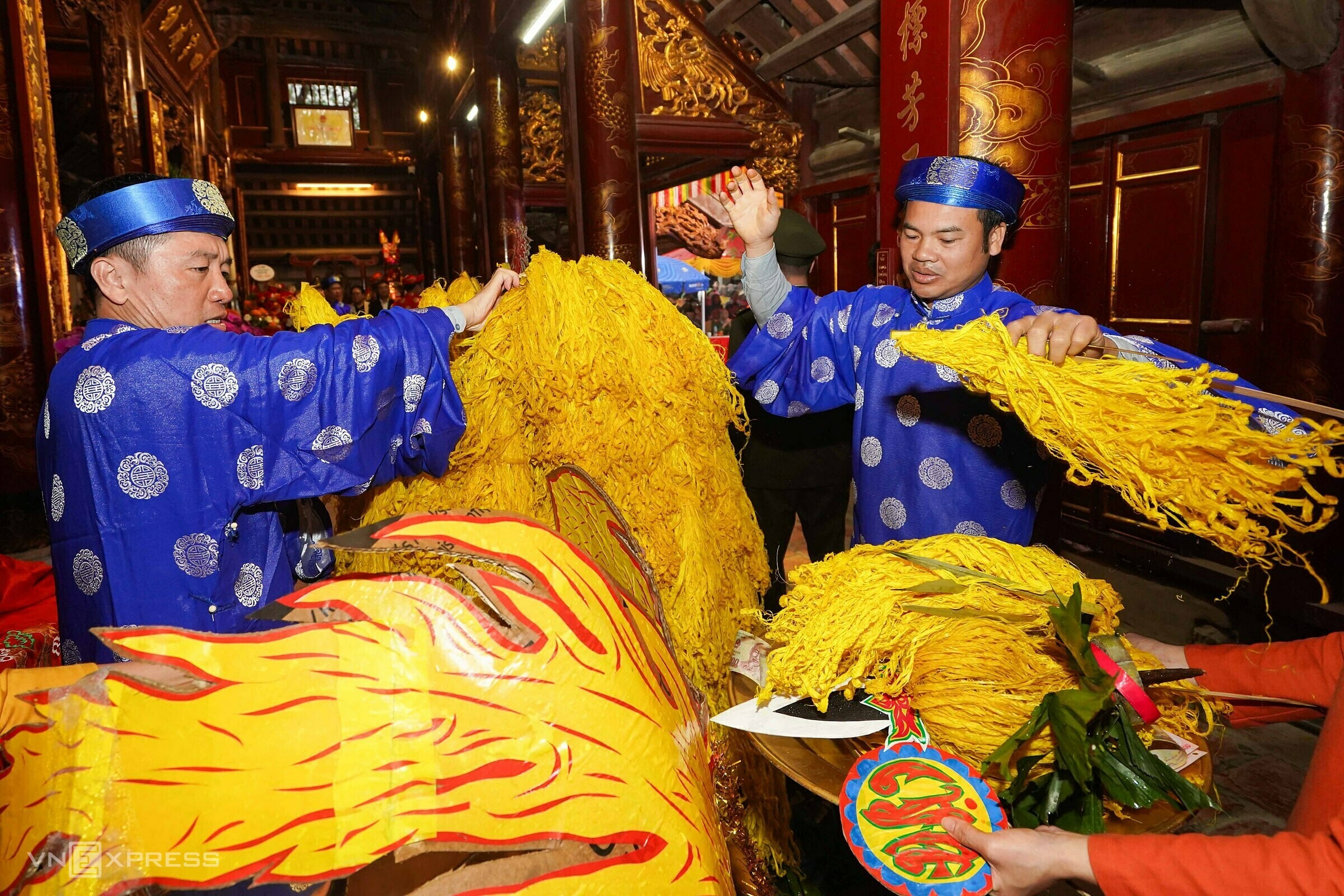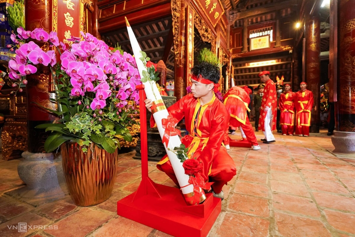 Người dân thôn Vệ Linh thực hiện nghi thức cung tiến hoa tre tại đền Thượng, thuộc quần thể Đền Sóc. Năm nay, số lượng hoa tre tương đương năm trước, khoảng 10.000 cây, được phát vào đêm giao thừa, đêm mộc dục (mùng 5 Tết) và ngày khai hội.