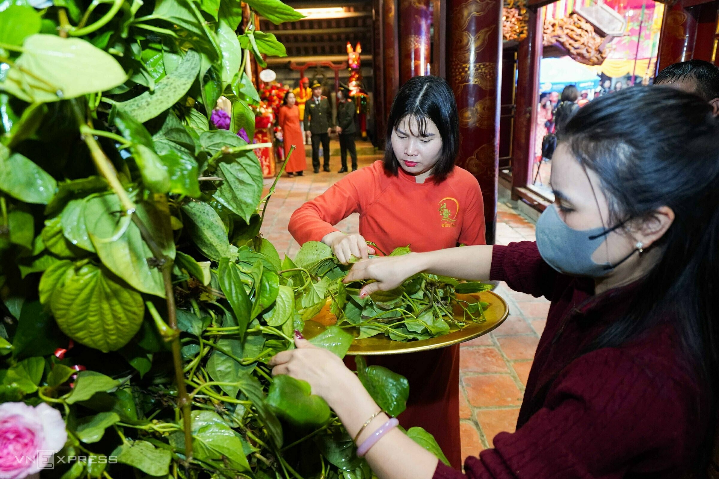 Người dân xếp hàng, di chuyển vào hậu cung đền thượng để nhận lộc hoa tre. Tại đây, mỗi người được phát một cành lộc cùng 3 lá trầu, 3 quả cau. Dù chuẩn bị nhiều lộc hoa tre, lượt xin quá đông khiến nhiều người ra về tay trắng.
