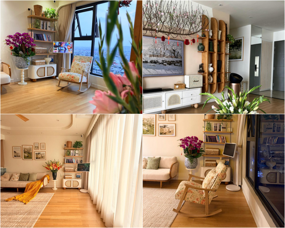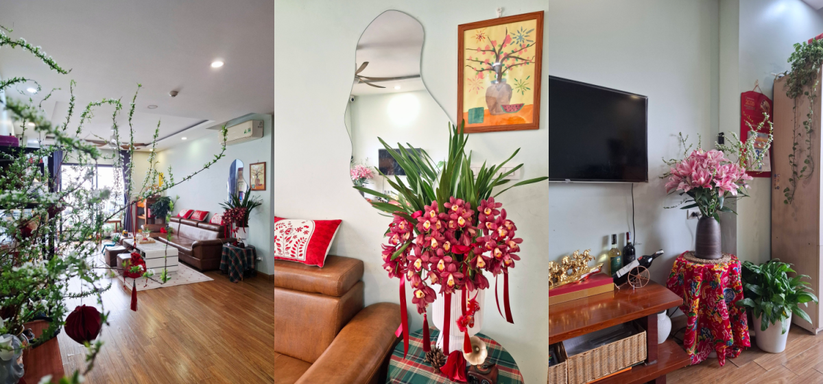 Gia chủ tâm sự nhiều năm trước chưa có nhà riêng nên không bày biện. Năm nay, khi đã có tổ ấm, chị tự tay dọn dẹp, xông lá thơm, đi chọn từng cành hoa để “giữ mùi Tết” trong nhà.