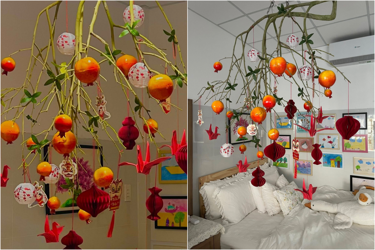 Trong căn nhà nhỏ ở tại TP HCM, gia chủ tận dụng trần nhà để tạo điểm nhấn Tết bằng một cành lựu treo ngược, kết hợp đèn lồng giấy, chim hạc gấp và phụ kiện.