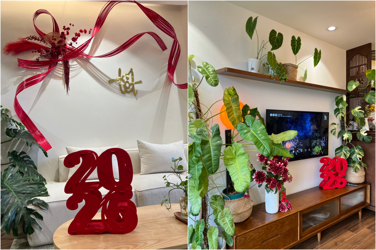 Trong căn hộ tại Hà Nội, nữ gia chủ tự tay hoàn thiện từng chi tiết trang trí Tết. Mảng tường phòng khách được nhấn bằng phên tre đỏ uốn cong, kết hợp chữ “Tết” ánh kim ở trung tâm. Bàn trà đặt khối số 2026 màu đỏ làm điểm nhìn chính, đồng bộ với bình hoa và phụ kiện xung quanh. Khu kệ tivi được bố trí đan xen cây xanh lá lớn để cân bằng sắc đỏ.