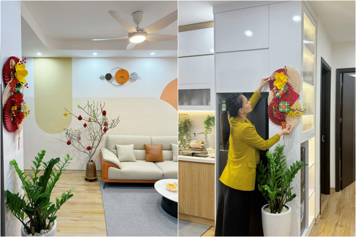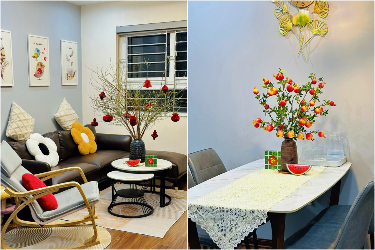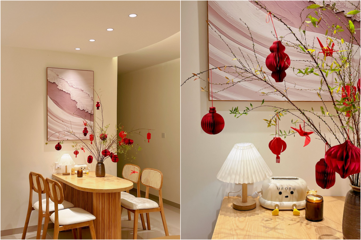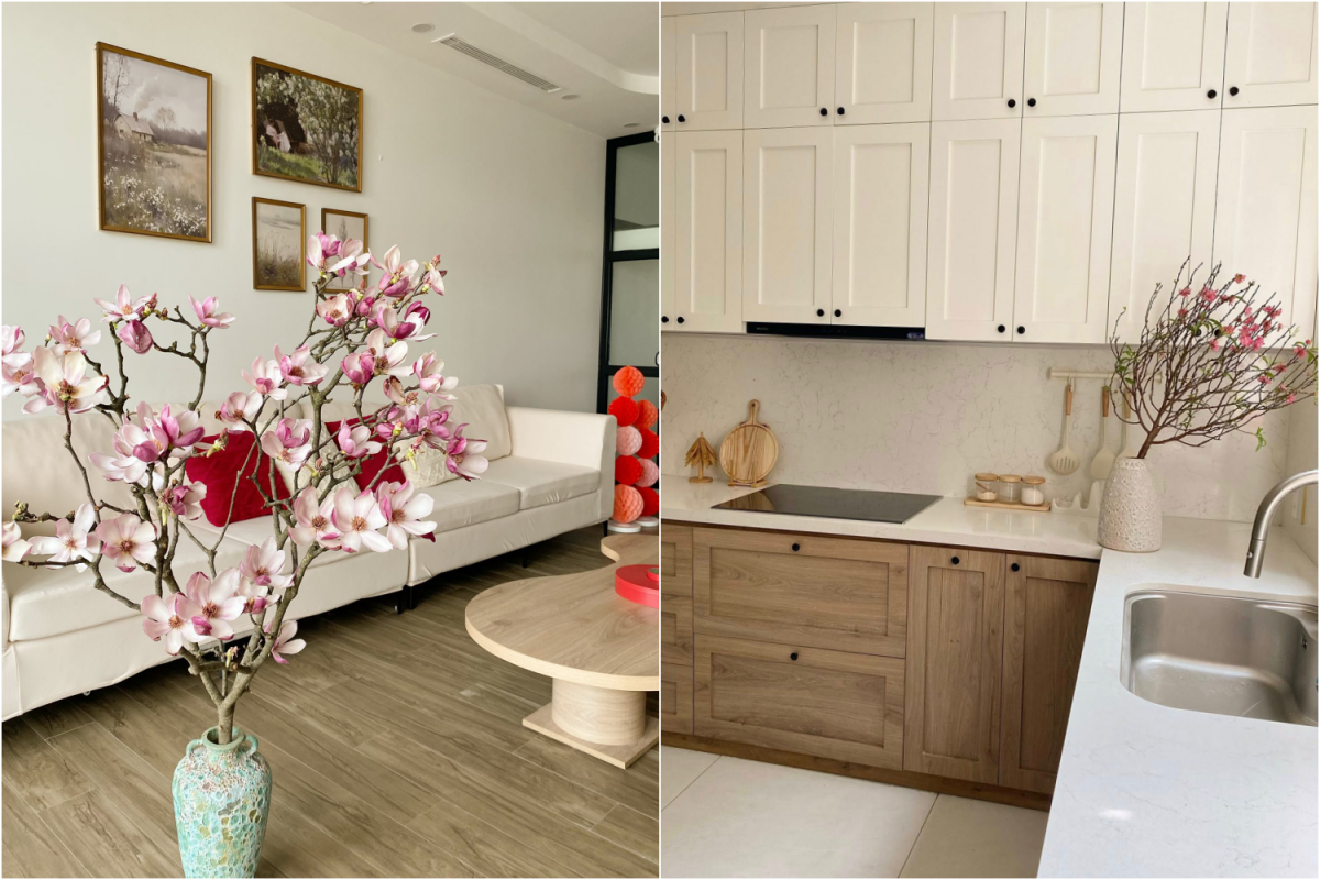 Căn hộ với gam sáng, mảng tường phối màu nhẹ nhàng và nội thất gỗ được gia chủ bổ sung một cành hoa treo lồng đèn đỏ đặt cạnh sofa, cùng mảng trang trí treo tường tại khu bếp. Các chi tiết tập trung ở một số điểm nhìn chính, phần còn lại giữ nguyên trạng để không gian thoáng và dễ dọn dẹp.