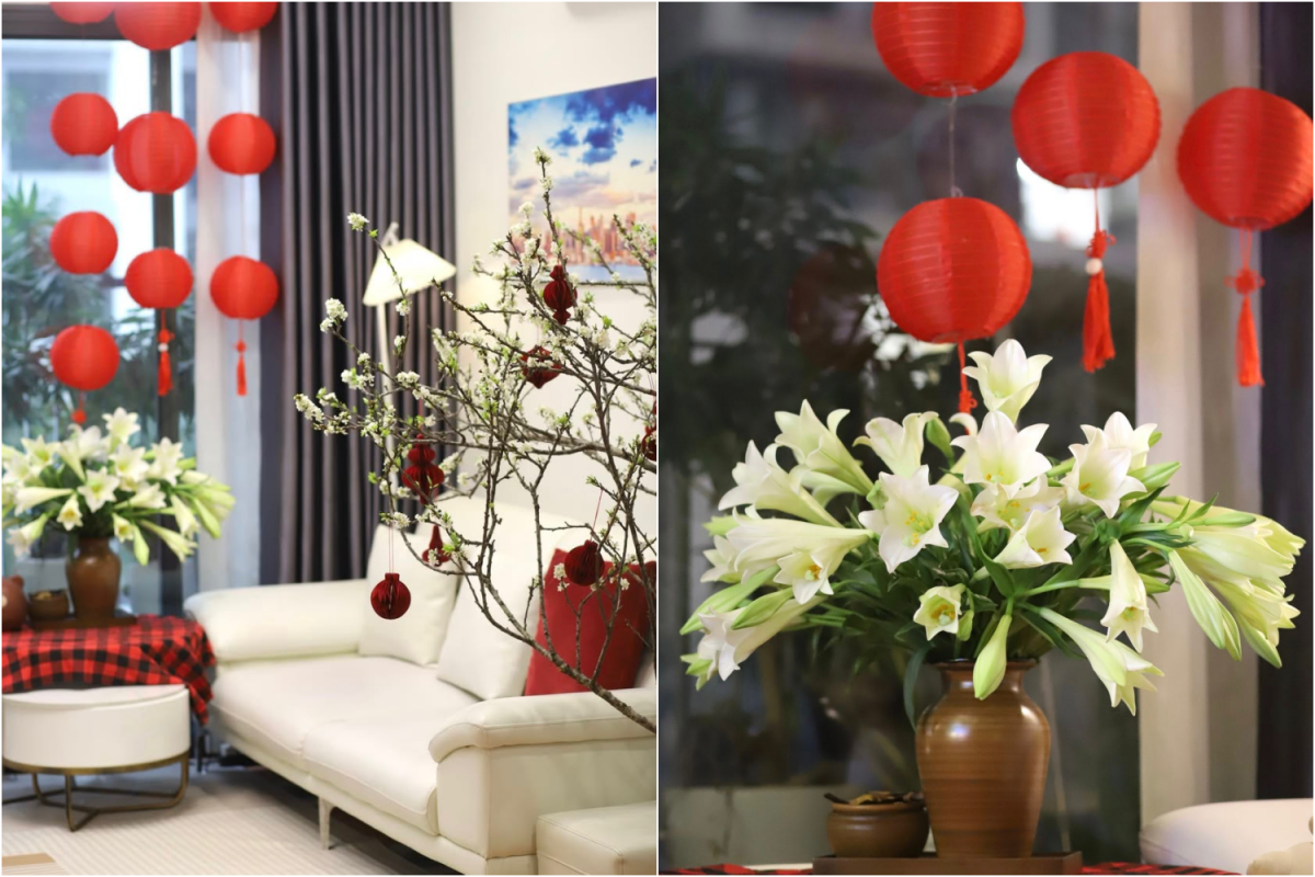 Phòng khách trong căn nhà ở Hà Nội cũng được gia chủ đặt bình tuyết mai trên bàn, treo xen kẽ các lồng đèn đỏ nhỏ. Gia chủ cho biết chưa đến Tết nhưng đã "sống vội" bằng một bình hoa nở sớm. Do nhà cửa được dọn dẹp thường xuyên quanh năm nên chị không mất nhiều thời gian tổng vệ sinh, chỉ cần thêm hoa tươi, cành đào và vài món đồ trang trí nhẹ nhàng là không khí Tết đã hiện diện.