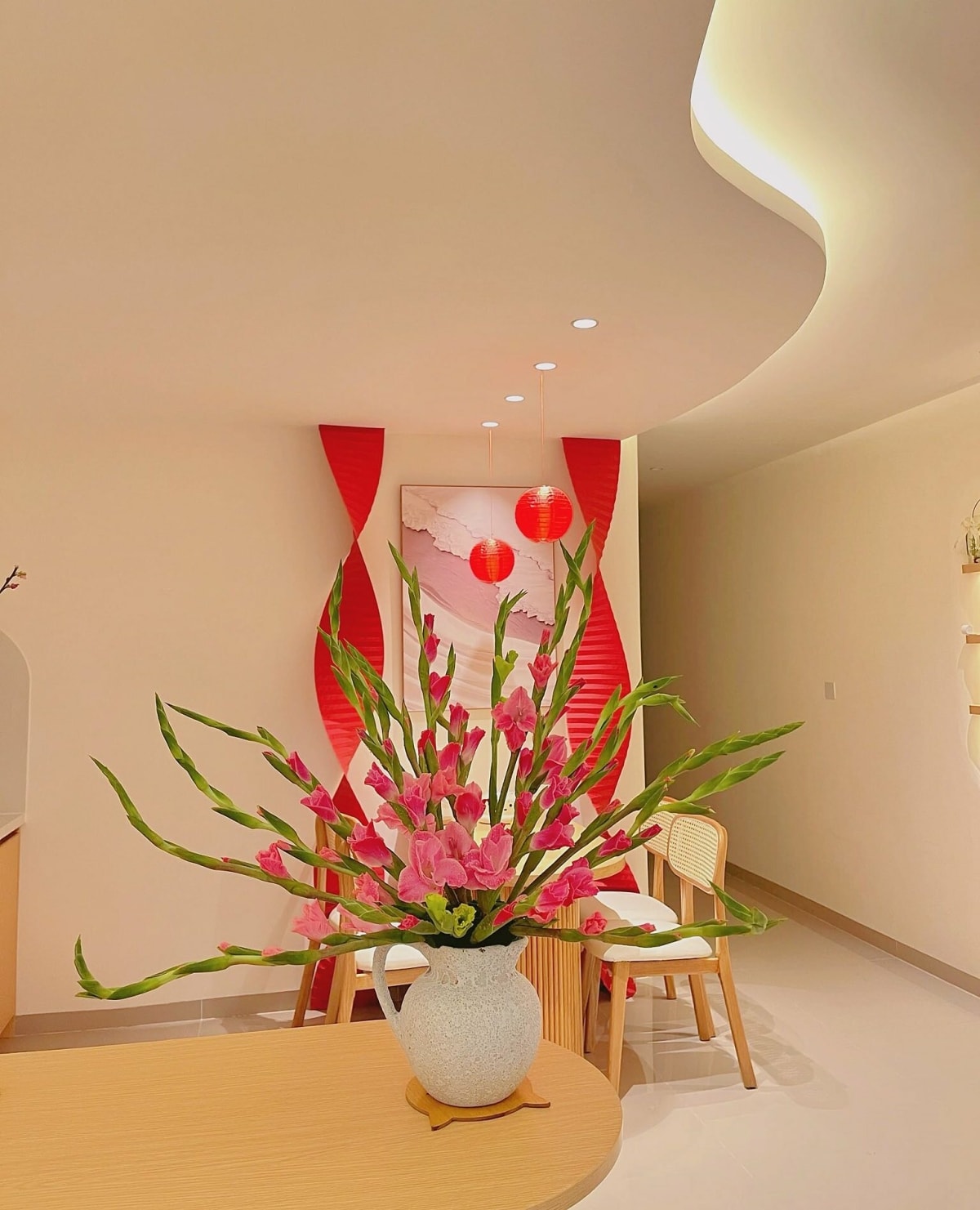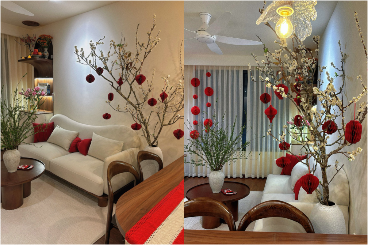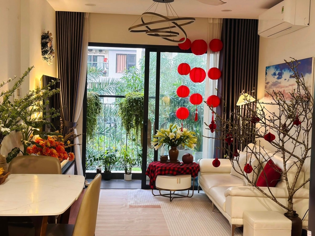 Tết len lỏi vào căn hộ ở Hà Nội bằng chùm đèn lồng đỏ thả nhẹ bên khung cửa, cành hoa đặt cạnh sofa trắng, thêm bình ly trắng trên bàn nhỏ phủ khăn caro. Không gian phòng khách không thay đổi nhiều về bố cục, chỉ cần điểm xuyết đúng chỗ là đủ thấy Xuân về.