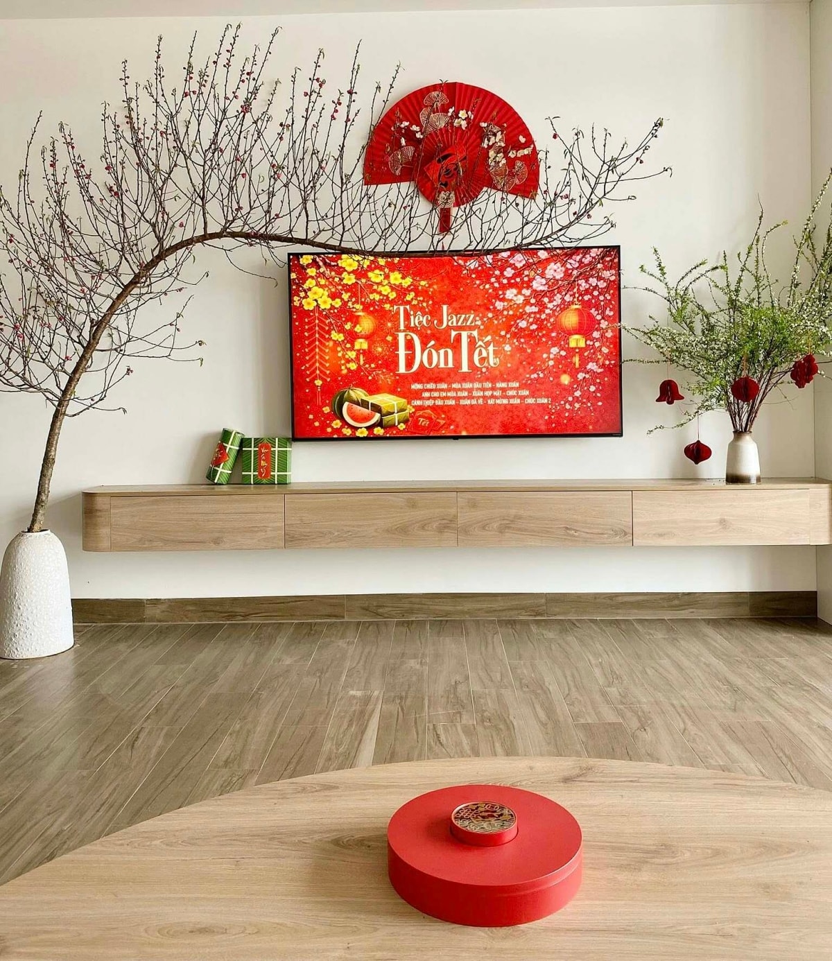 Không gian Tết được gia chủ trang trí bằng cành đào huyền lớn uốn cong ôm trọn mảng tường phòng khách, kết hợp quạt đỏ tạo điểm nhấn. Bàn trà gỗ thấp, kệ treo màu gỗ sáng giúp hoa và phụ kiện Tết nổi bật hơn.