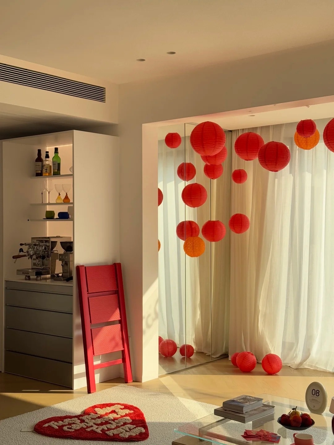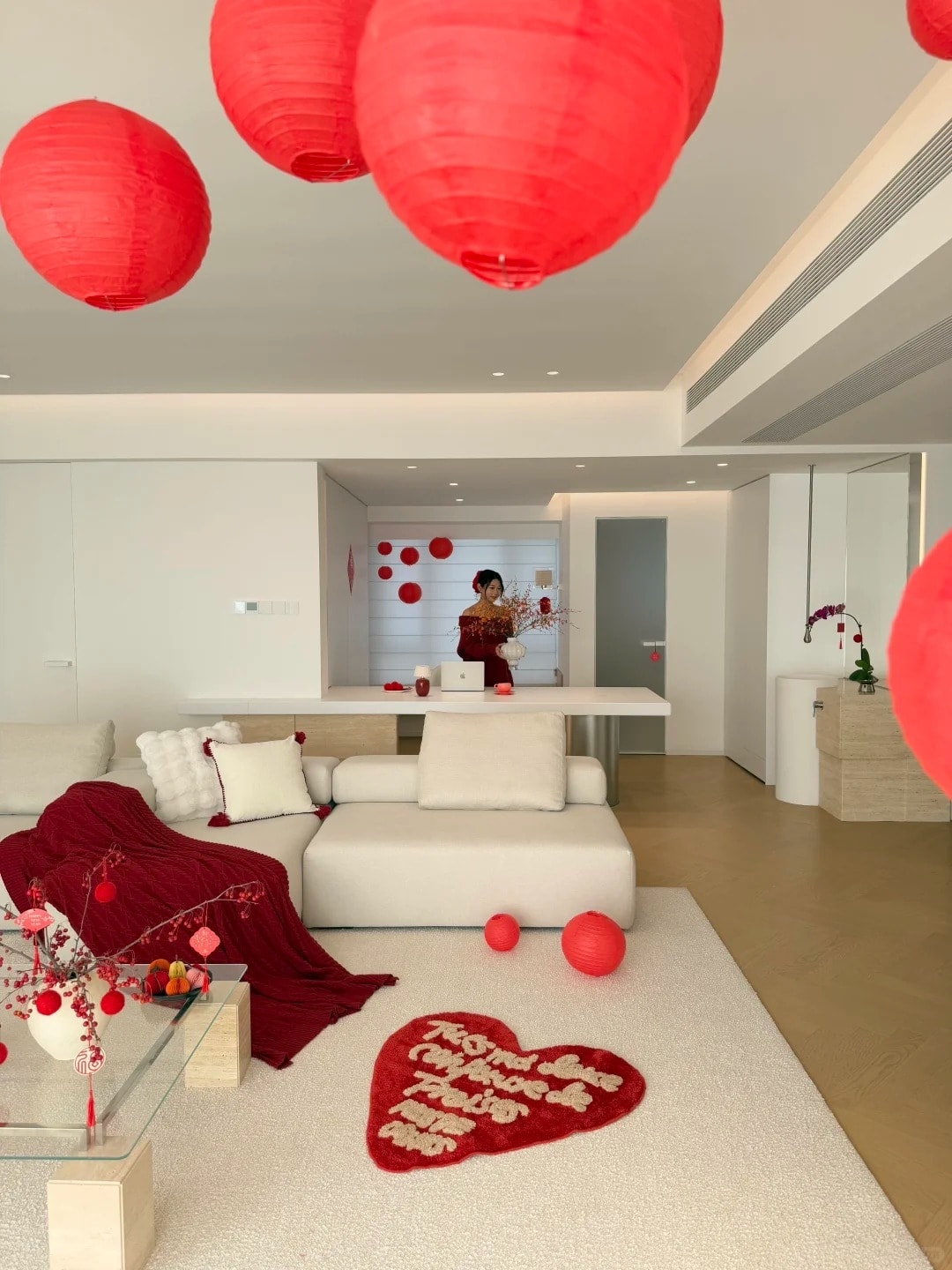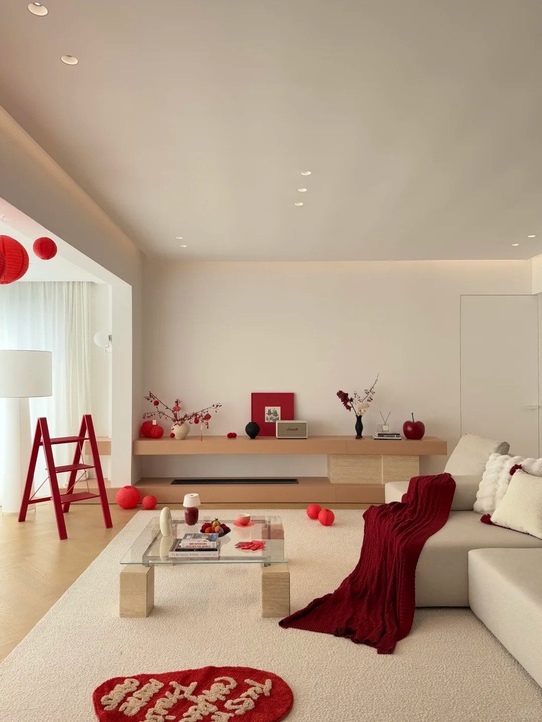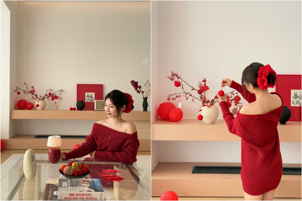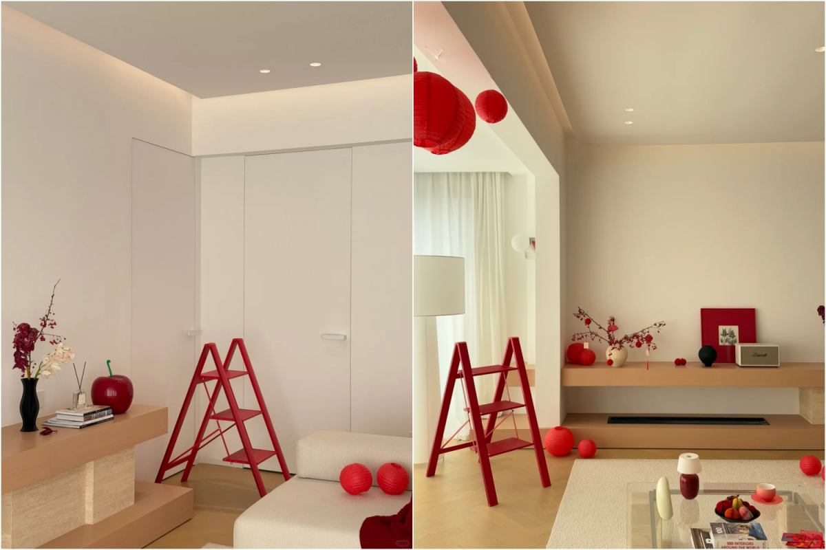 Căn hộ 135 m2 được gia chủ giữ màu nền tối giản, bổ sung sắc đỏ và đồ trang trí để tạo không khí Tết.