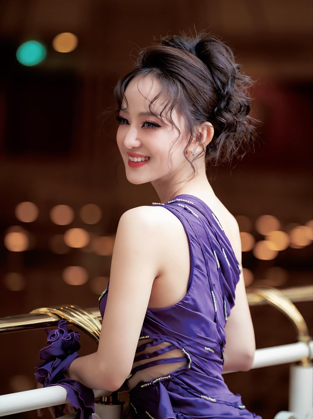Cô diện trang phục cut out, xuyên thấu, để tóc búi cao trong một sự kiện.