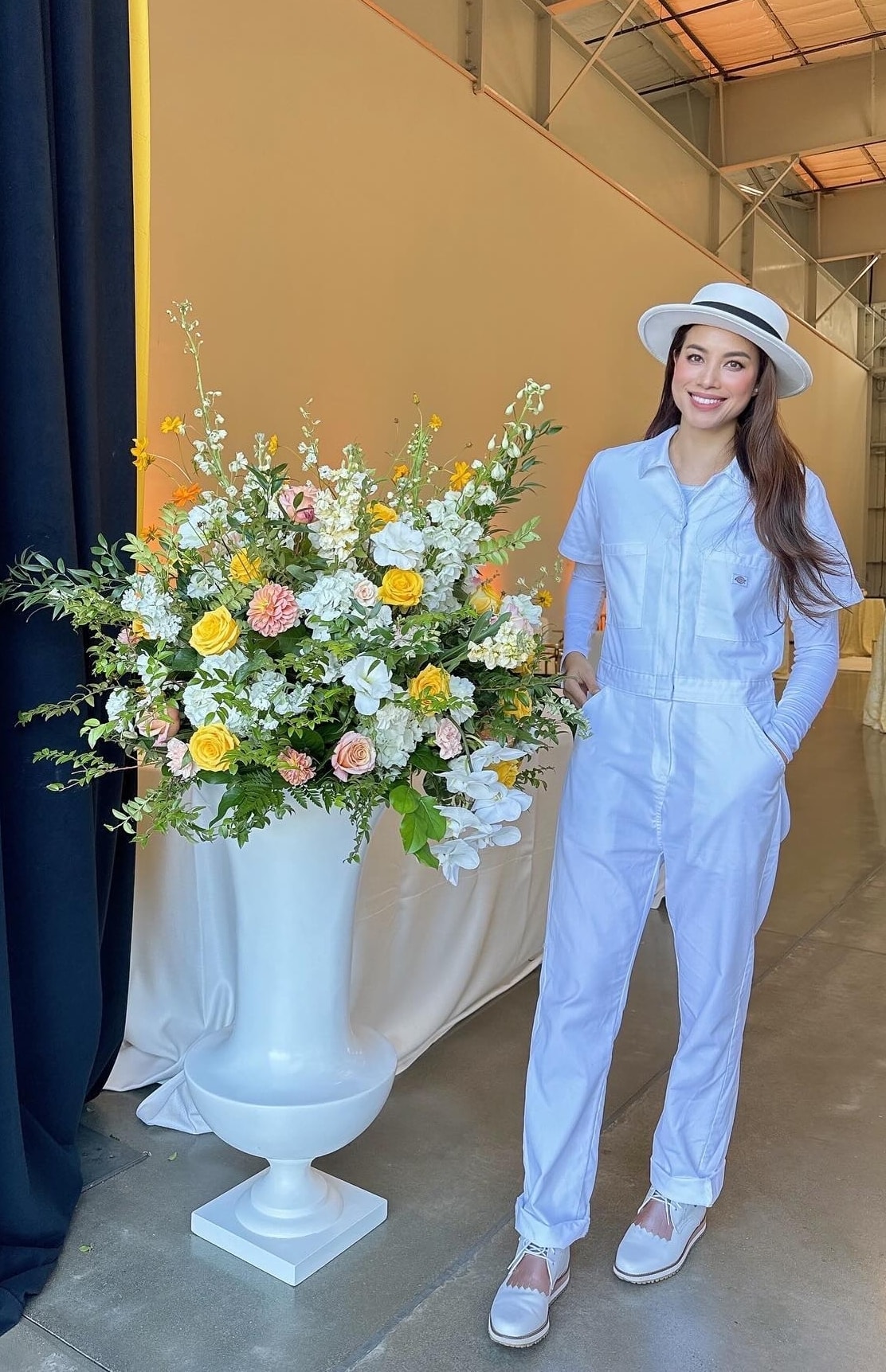 Phạm Hương tạo dáng trước cửa hàng hoa.