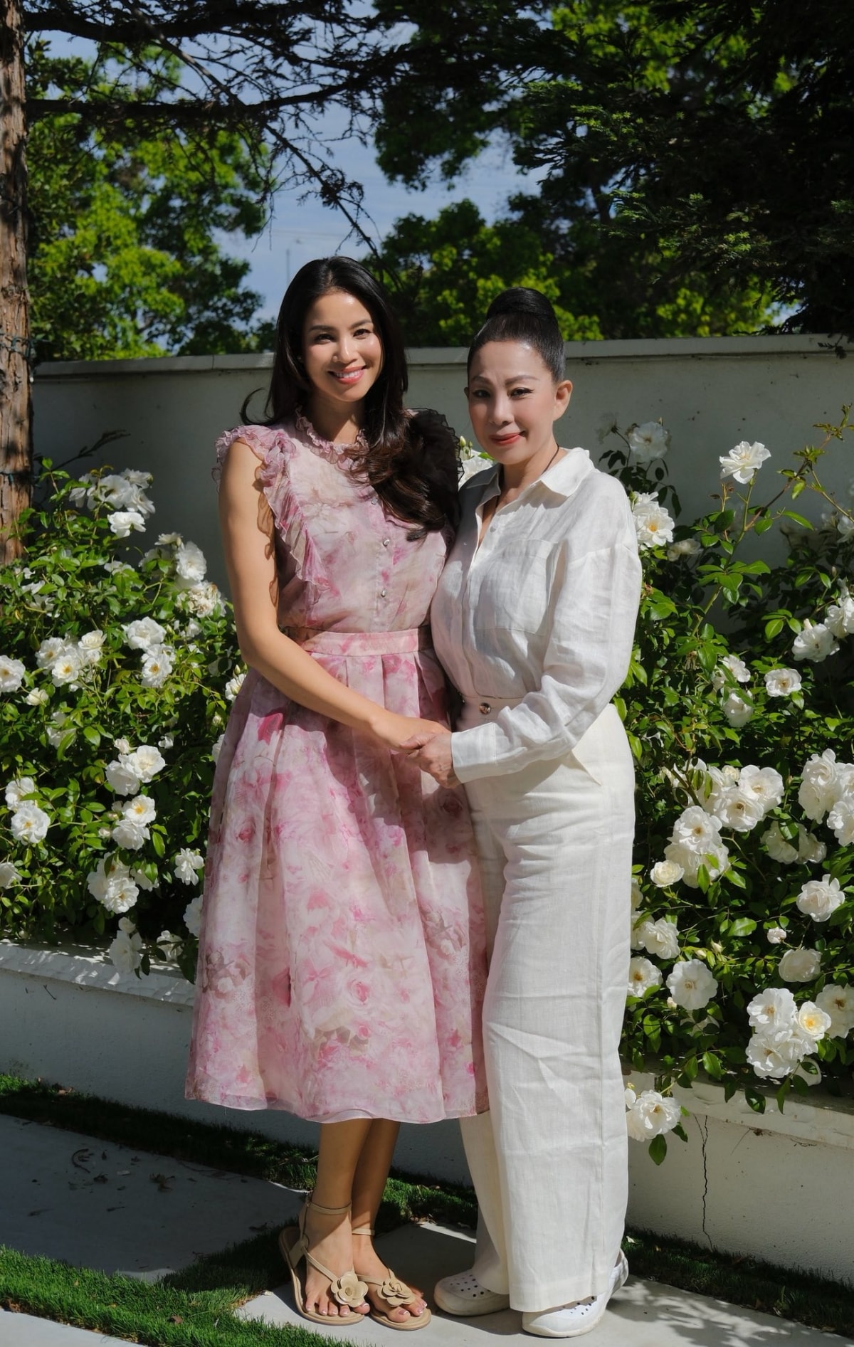 Ngày 13/4, Phạm Hương hội ngộ nhà thiết kế Linh San ở Mỹ. Hình ảnh mỹ nhân diện đầm họa tiết hoa, kiểu dáng bèo nhún được fan chia sẻ lại trên nhiều diễn đàn sắc đẹp kèm bình luận khen ngợi sắc vóc.