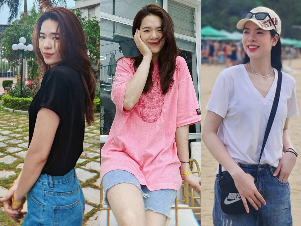 Cô thường phối áo thun cùng quần jeans ống rộng hoặc quần shorts, kết hợp nón lưỡi trai, túi đeo chéo khi dạo chơi.