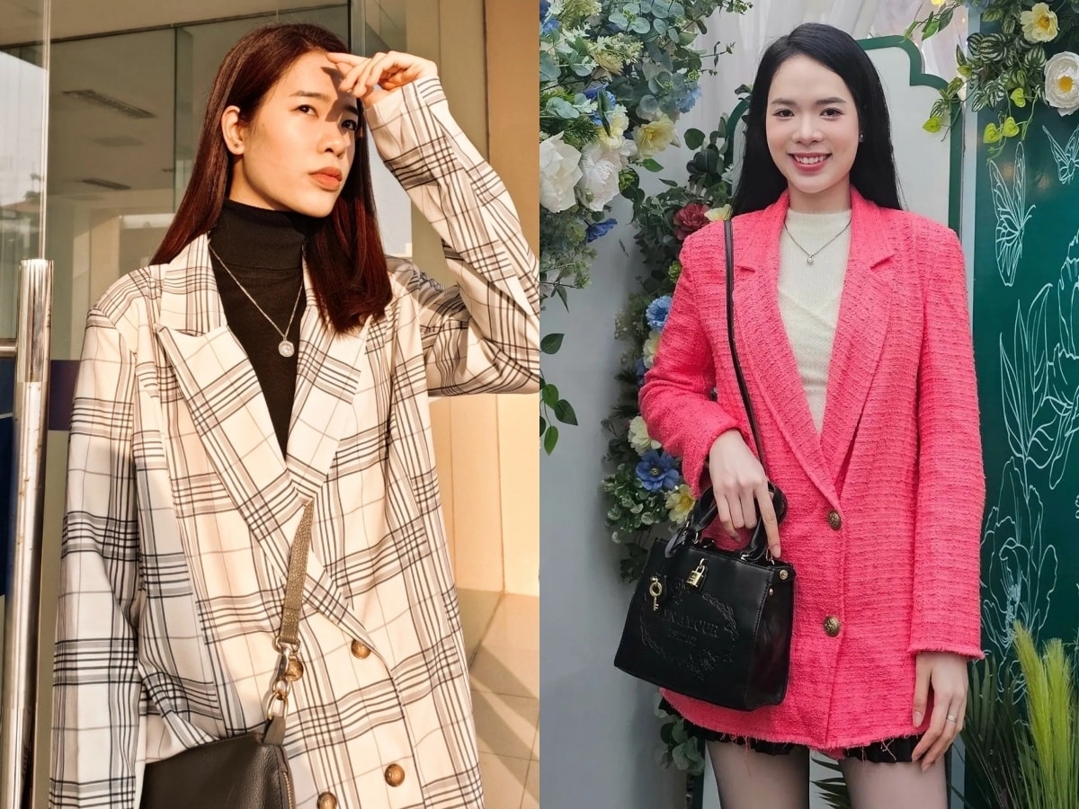 Cô còn chuộng blazer dáng rộng kết hợp áo cổ cao, quần tất.