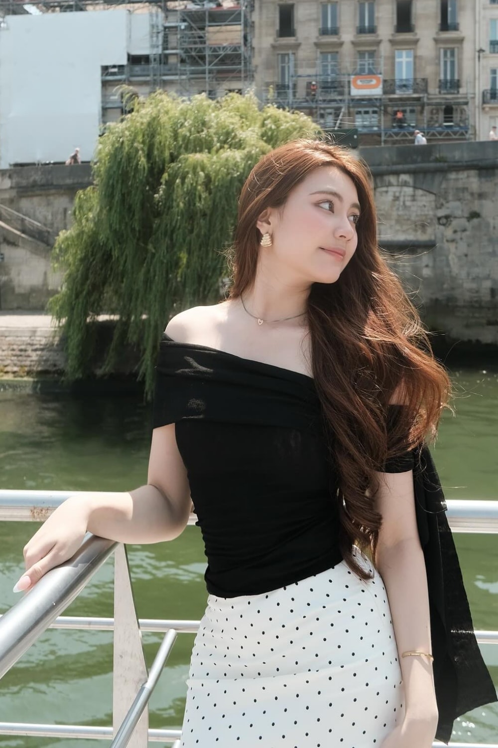 Cô mặc váy chấm bi phối cùng áo hở vai khi ngắm cảnh ở Paris, Pháp. Người đẹp bám sát các xu hướng thời trang thịnh hành của Gen Z, thường chuộng trang phục phóng khoáng với độ hở vừa phải.