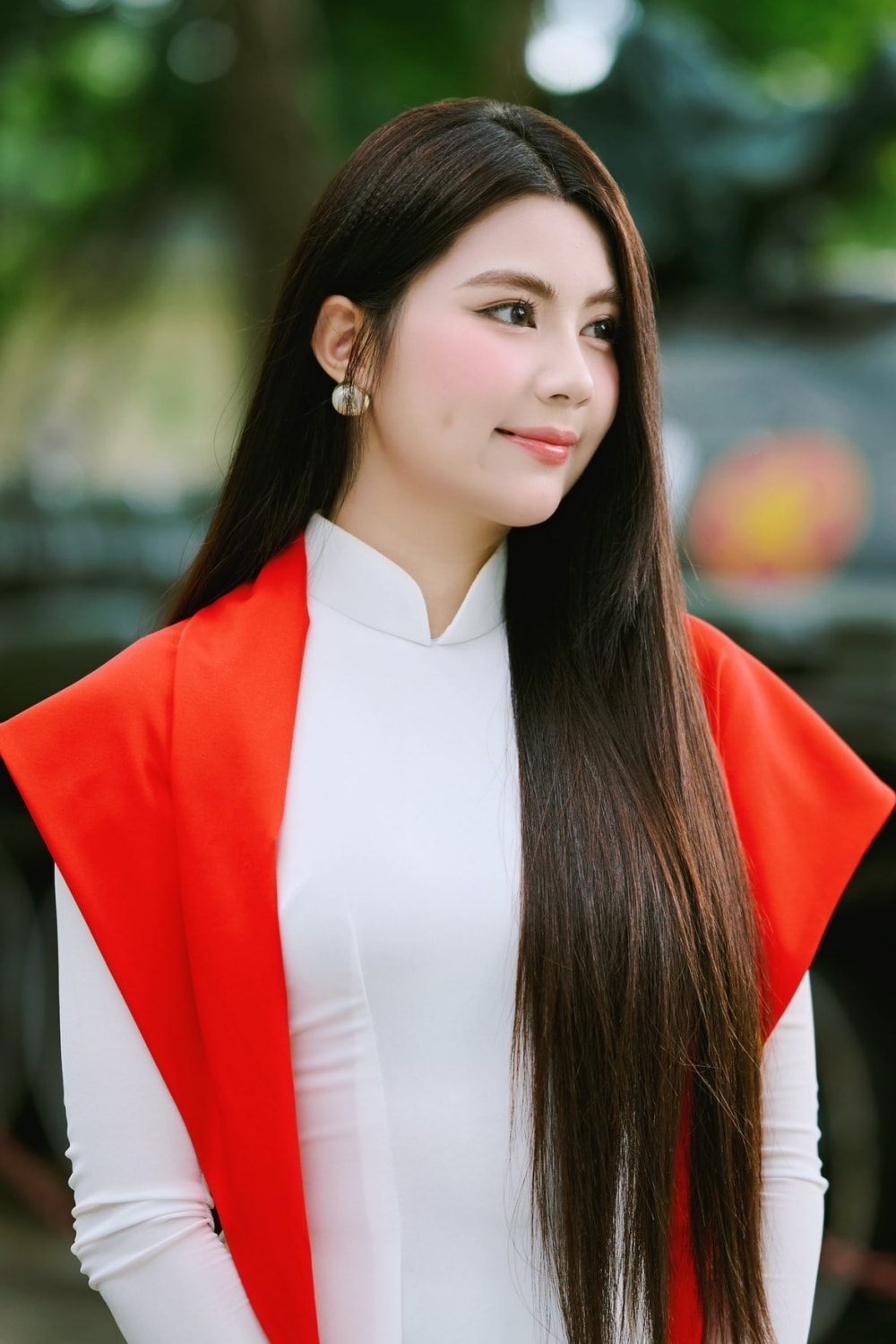 Hạt Dẻ chụp ảnh với áo dài trắng, mừng dịp 80 năm Quốc Khánh dịp 2/9/2025.