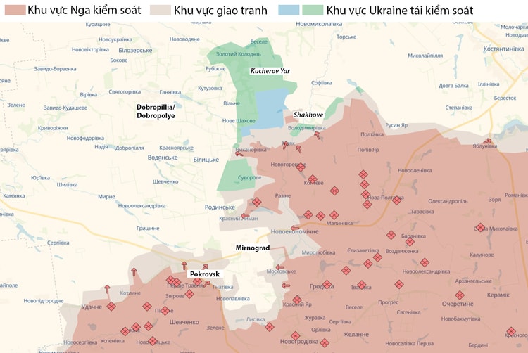 Trong vòng hai tháng qua, quân đội Nga đã tạo gọng kìm lớn nhằm vây chặt Pokrovsk và Mirnograd, do hai thành phố có liên kết chặt chẽ về mặt hậu cần. Ukrainska Pravda, báo điện tử phổ biến nhất ở Ukraine, cho biết ngày càng nhiều người chấp nhận kịch bản "Pokrovsk chắc chắn thất thủ".