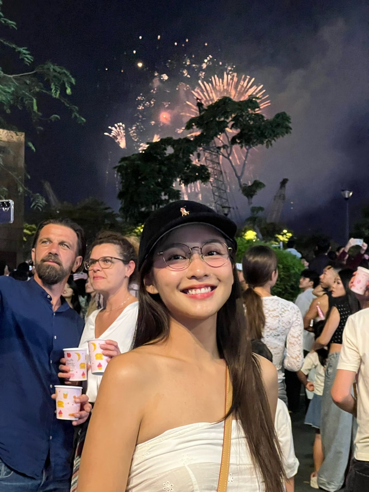 Bảo Thy nói năm nay không nhận show vào thời điểm cuối năm, dành thời gian cho gia đình. Cô cùng chồng con ngắm pháo hoa ở Công viên bờ sông Sài Gòn.